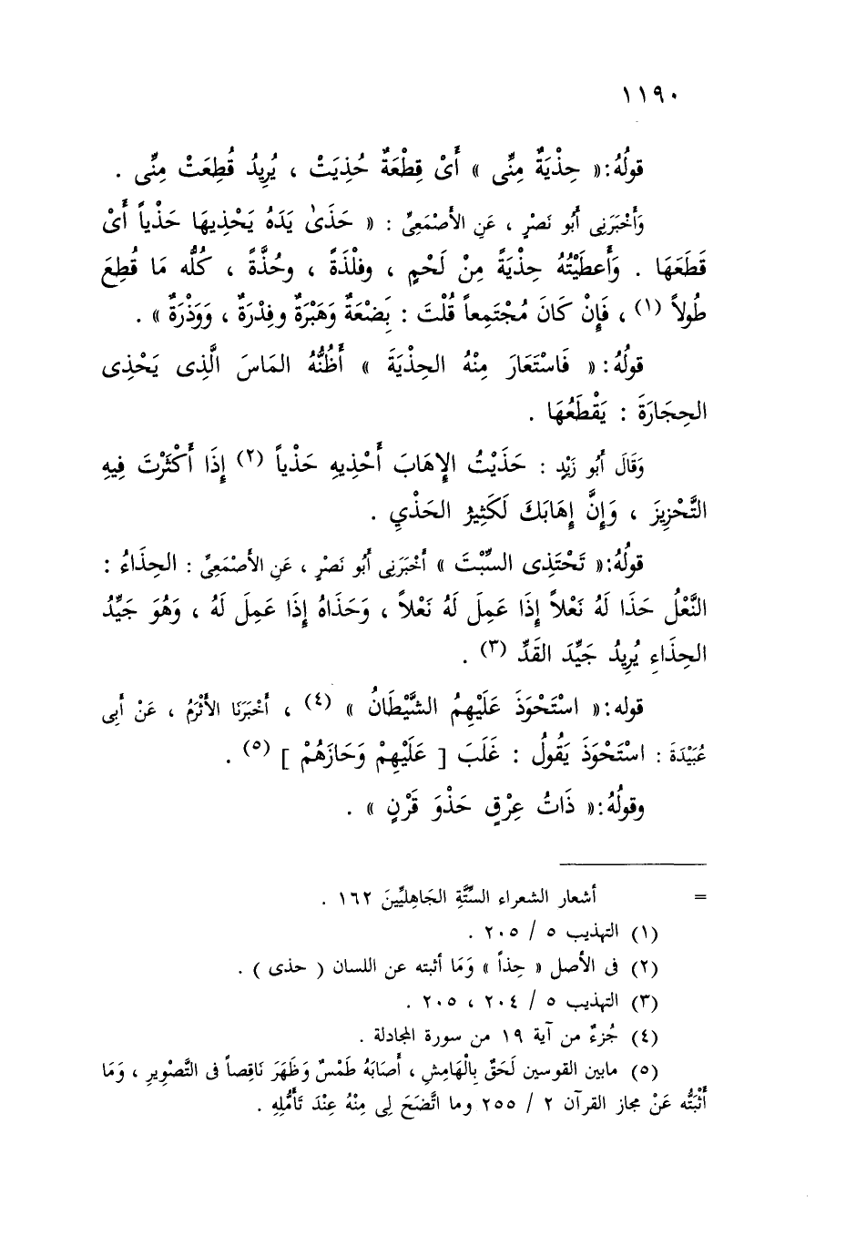 قَوْلُهُ: «حِذْيَةٌ مِنِّي» أَيْ قِطْعَةٌ حُذِيَتْ، يُرِيدُ قُطِعَتْ مِنِّي وَأَخْبَرَنِي أَبُو نَصْرٍ، عَنِ الْأَصْمَعِيِّ: حَذَى يَدَهُ يَحْذِيهَا حَذْيًا أَيْ قَطَعَهَا وَأَعْطَيْتُهُ حِذْيَةً مِنْ لَحْمٍ، وَفَلْذَةً، وَحُذَّةً: كُلُّهُ مَا قُطِعَ طُولًا، فَإِنْ كَانَ مُجْتَمِعًا قُلْتَ: بُضْعَةٌ، وَهَبْرَةٌ، وَفِدْرَةٌ، وَوَذْرَةٌ قَوْلُهُ: «فَاسْتَعَارَ مِنْهُ الْحِذْيَةَ» : أَظُنُّهُ الْمَاسَ الَّذِي يَحْذِي الْحِجَارَةَ: يَقْطَعُهَا وَقَالَ أَبُو زَيْدٍ: حَذَيْتُ الْإِهَابَ أَحْذِيهِ حَذْيًا إِذَا أَكْثَرْتُ فِيهِ التَّحْزِيزَ، وَإِنَّ إِهَابَكَ لَكَثِيرُ الْحَذْيِ قَوْلُهُ: «تَحْتَذِي السَّبْتَ» أَخْبَرَنِي أَبُو نَصْرٍ، عَنِ الْأَصْمَعِيِّ: الْحِذَاءُ: النَّعْلُ، حَذَا لَهُ نَعْلًا إِذَا عَمِلَ لَهُ نَعْلًا، وَحَذَاهُ إِذَا عَمِلَ لَهُ، وَهُوَ جَيِّدُ الْحِذَاءِ، يُرِيدُ: جَيِّدُ الْقِدِّ قَوْلُهُ: «اسْتَحْوَذَ عَلَيْهِمُ الشَّيْطَانُ» أَخْبَرَنَا الْأَثْرَمُ، عَنْ أَبِي عُبَيْدَةَ: اسْتَحْوَذَ يَقُولُ: غَلَبَ عَلَيْهِمْ وَحَازَهُمْ وَقَوْلُهُ: «ذَاتُ عِرْقٍ حَذْوَ قَرْنٍ»