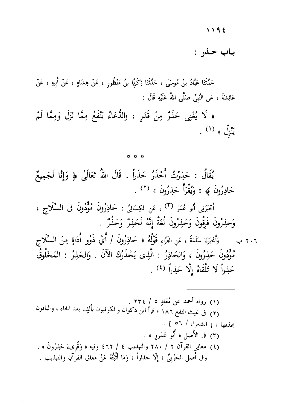 حَدَّثَنَا عَبَّادُ بْنُ مُوسَى، حَدَّثَنَا زَكَرِيَّا بْنُ مَنْظُورٍ، عَنْ هِشَامٍ، عَنْ أَبِيهِ، عَنْ عَائِشَةَ، عَنِ النَّبِيِّ صَلَّى اللَّهُ عَلَيْهِ قَالَ: «§لَا يُغْنِي حَذَرٌ مِنْ قَدَرٍ، وَالدُّعَاءُ يَنْفَعُ مِمَّا نَزَلَ وَمِمَّا لَمْ يَنْزِلْ» يُقَالُ: حَذِرْتُ أَحْذَرُ حَذَرًا قَالَ اللَّهُ تَعَالَى: {وَإِنَّا لَجَمِيعٌ حَاذِرُونَ} [الشعراء: 56] ، وَيُقْرَأُ: حَذِرُونَ أَخْبَرَنِي أَبُو عَمْرٍو، عَنِ الْكِسَائِيِّ: حَاذِرُونَ: مُؤْدُونَ فِي السِّلَاحِ، وَحَذِرُونَ: فَرِقُونَ، وَحَذِرُونَ: لُغَةٌ إِنَّهُ لَحَذِرٌ وَحَذُرٌ وَأَخْبَرَنَا سَلَمَةُ، عَنِ الْفَرَّاءِ: قَوْلُهُ: " حَاذِرُونَ: أَيْ ذَوُو أَدَاةٍ مِنَ السِّلَاحِ مُؤْدُونَ حَذِرُونَ، وَالْحَاذِرُ: الَّذِي يَحْذَرُكَ الْآنَ وَالْحَذِرُ: الْمَخْلُوقُ حَذِرًا لَا تَلْقَاهُ إِلَّا حَذِرًا -[1195]- وَأَخْبَرَنَا الْأَثْرَمُ، عَنْ أَبِي عُبَيْدَةَ: قَوْلُهُ: «حَذِرُونَ» وَأَنْشَدَنَا: