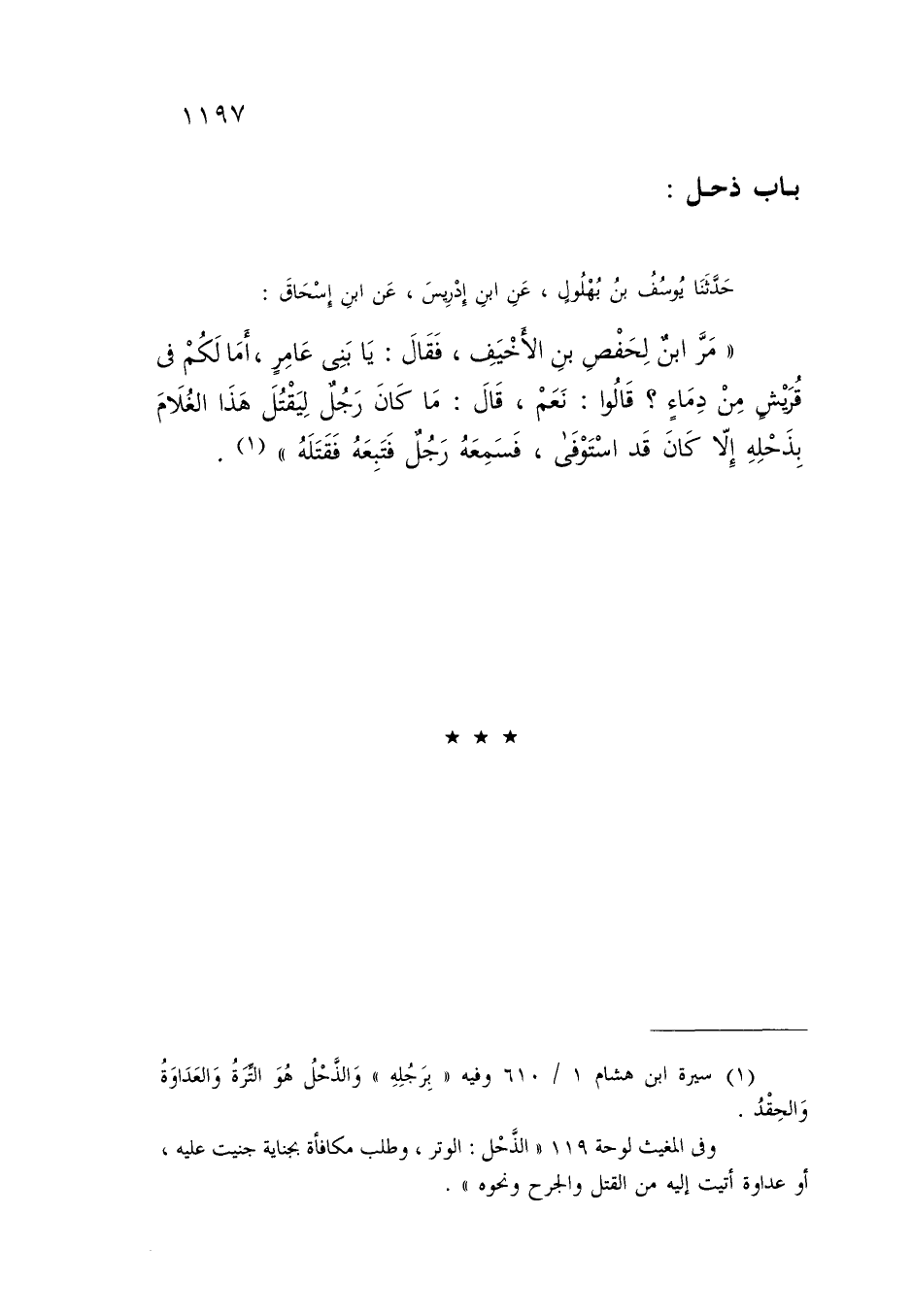 حَدَّثَنَا يُوسُفُ بْنُ بُهْلُولٍ، عَنِ ابْنِ إِدْرِيسَ، عَنِ ابْنِ إِسْحَاقَ: " مَرَّ ابْنٌ لِحَفْصِ بْنِ الْأَخْيَفِ، فَقَالَ: يَا بَنِي عَامِرٍ، أَمَا لَكُمْ فِي قُرَيْشٍ مِنْ دِمَاءٍ؟ قَالُوا: نَعَمْ، قَالَ: §مَا كَانَ رَجُلٌ لِيَقْتُلَ هَذَا الْغُلَامَ بِذَحْلِهِ إِلَّا كَانَ قَدِ اسْتَوْفَى، فَسَمِعَهُ رَجُلٌ فَتَبِعَهُ فَقَتَلَهُ "