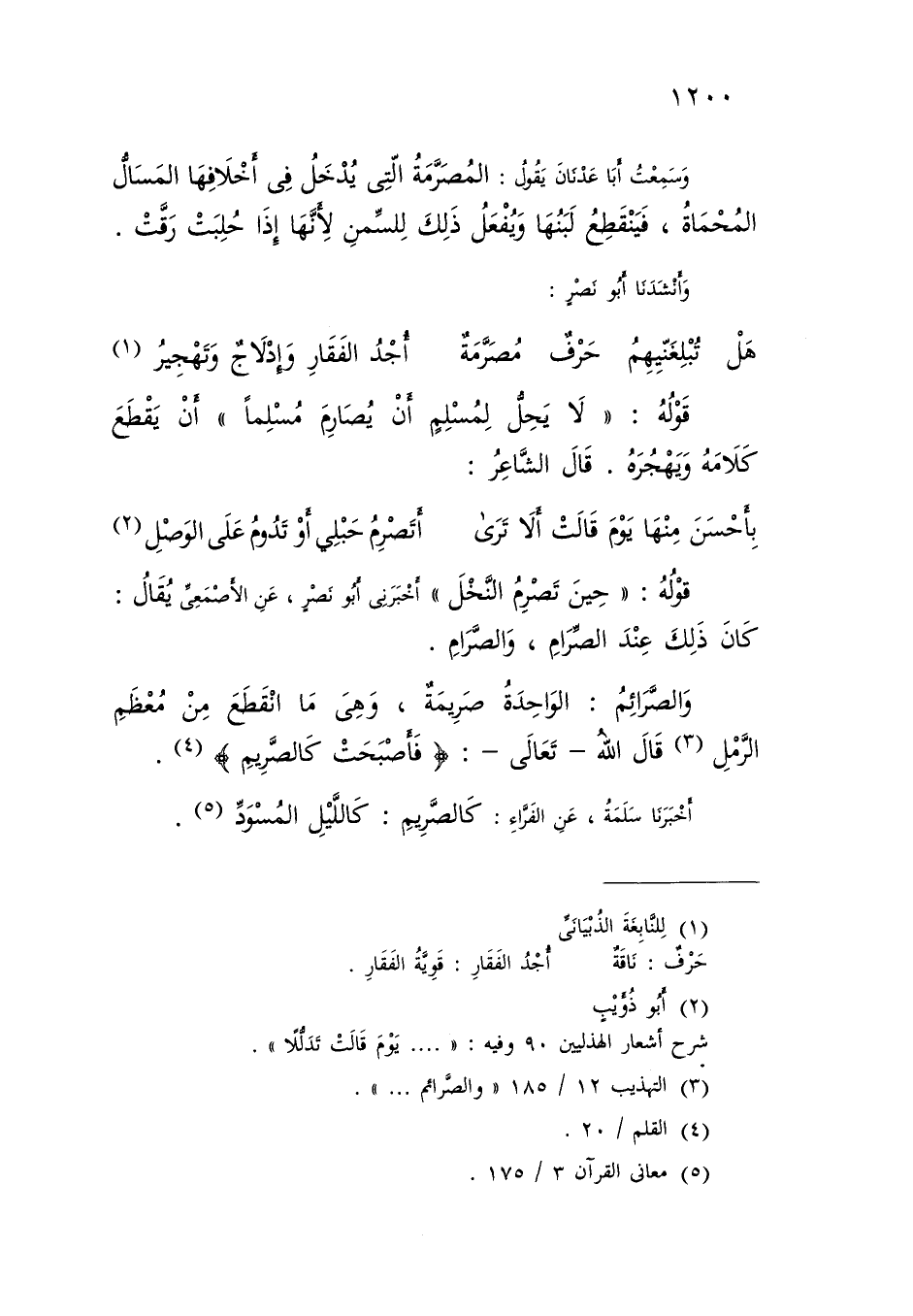 وَسَمِعْتُ أَبَا عَدْنَانَ يَقُولُ: الْمُصَرَّمَةُ الَّتِي يُدْخَلُ فِي أَخْلَافِهَا الْمَسَالُّ الْمُحْمَاةُ، فَيَنْقَطِعُ لَبَنُهَا، وَيُفْعَلُ ذَلِكَ لِلسِّمَنِ لِأَنَّهَا إِذَا حُلِبَتْ رَقَّتْ وَأَنْشَدَنَا أَبُو نَصْرٍ: