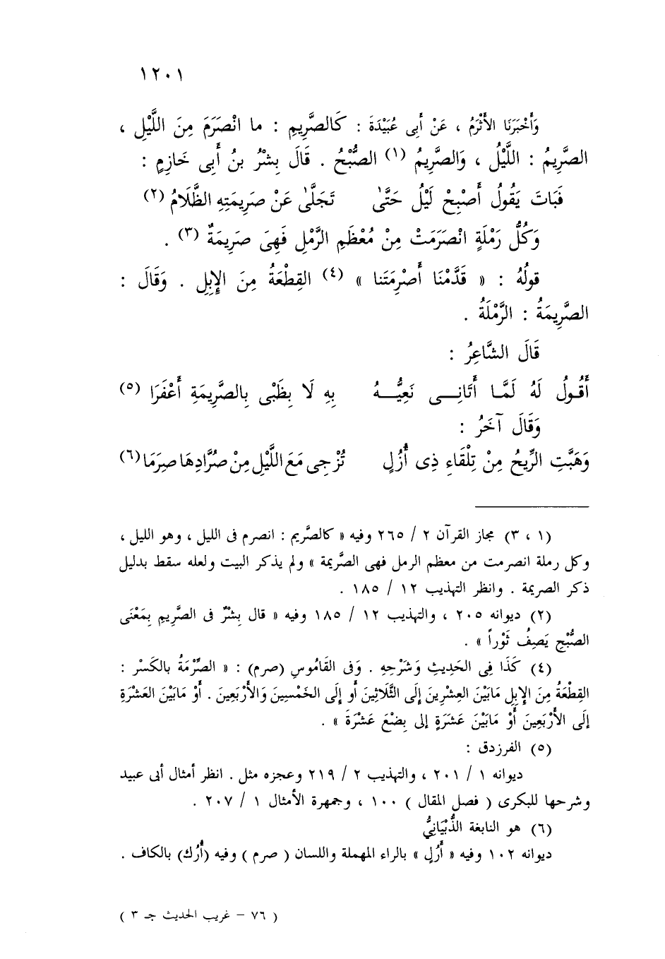 وَأَخْبَرَنَا الْأَثْرَمُ، عَنْ أَبِي عُبَيْدَةَ: كَالصَّرِيمِ: مَا انْصَرَمَ مِنَ اللَّيْلِ، الصَّرِيمُ: اللَّيْلُ، وَالصَّرِيمُ الصُّبْحُ قَالَ بِشْرُ بْنُ أَبِي خَازِمٍ: