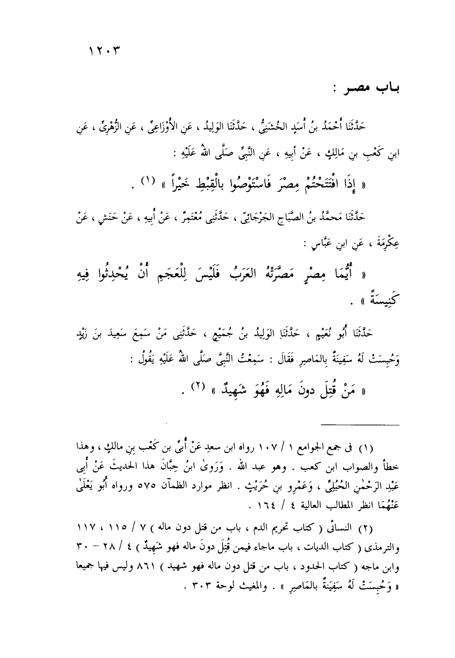 حَدَّثَنَا أَحْمَدُ بْنُ أَسَدٍ الْخُشَنِيُّ، حَدَّثَنَا الْوَلِيدُ، عَنِ الْأَوْزَاعِيِّ، عَنِ الزُّهْرِيِّ، عَنِ ابْنِ كَعْبِ بْنِ مَالِكٍ، عَنْ أَبِيهِ، عَنِ النَّبِيِّ صَلَّى اللَّهُ عَلَيْهِ: «§إِذَا افْتَتَحْتُمْ مِصْرَ فَاسْتَوْصُوا بِالْقِبْطِ خَيْرًا»