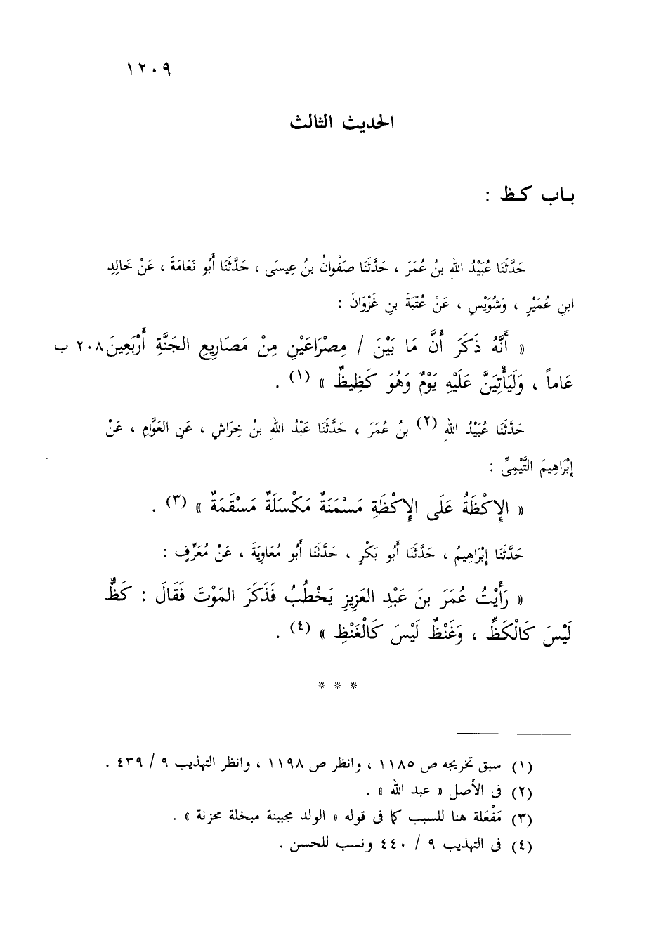 حَدَّثَنَا عُبَيْدُ اللَّهِ بْنُ عُمَرَ، حَدَّثَنَا صَفْوَانُ بْنُ عِيسَى، حَدَّثَنَا أَبُو نَعَامَةَ، عَنْ خَالِدِ ابْنِ عُمَيْرٍ، وَشُوَيْسٍ، عَنْ عُتْبَةَ بْنِ غَزْوَانَ: «§أَنَّهُ ذَكَرَ أَنَّ مَا، بَيْنَ مِصْرَاعَيْنِ مِنْ مَصَارِيعِ الْجَنَّةِ أَرْبَعِينَ عَامًا، وَلَيَأْتِيَنَّ عَلَيْهِ يَوْمٌ وَهُوَ كَظِيظٌ»