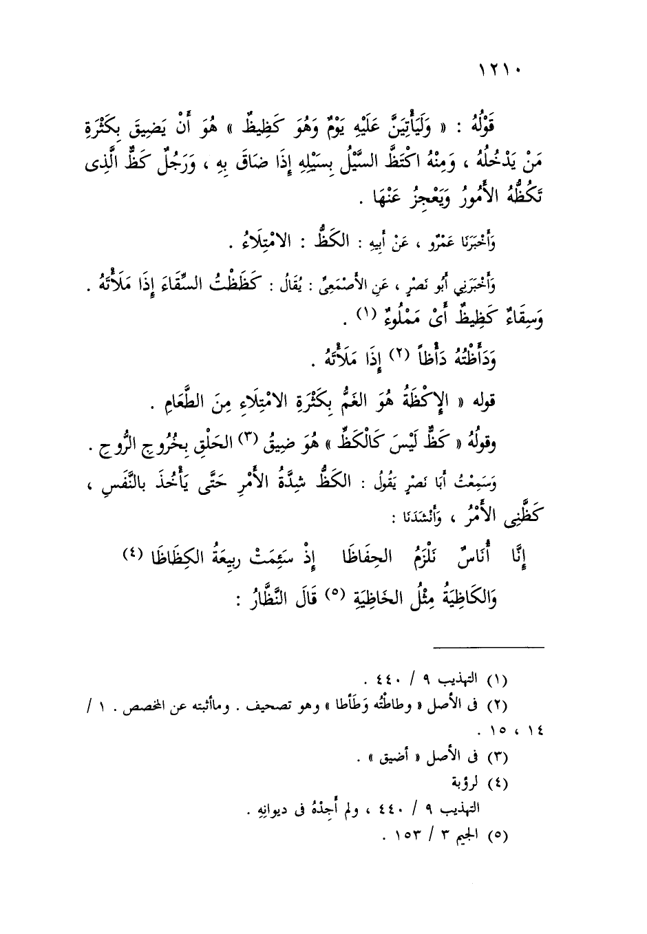 قَوْلُهُ: «وَلَيَأْتِيَنَّ عَلَيْهِ يَوْمٌ وَهُوَ كَظِيظٌ» هُوَ أَنْ يَضِيقَ بِكَثْرَةِ مَنْ يَدْخُلُهُ، وَمِنْهُ اكْتَظَّ السَّيْلُ بِسَيْلِهِ إِذَا ضَاقَ بِهِ، وَرَجُلٌ كَظٌّ: الَّذِي تَكُظُّهُ الْأُمُورُ وَيَعْجَزُ عَنْهَا وَأَخْبَرَنَا عَمْرٌو، عَنْ أَبِيهِ: الْكَظُّ: الِامْتِلَاءُ وَأَخْبَرَنِي أَبُو نَصْرٍ، عَنِ الْأَصْمَعِيِّ: يُقَالُ: كَظَظْتُ السِّقَاءَ: إِذَا مَلَأْتَهُ , وَسِقَاءٌ كَظِيظٌ: أَيْ مَمْلُوءٌ وَدَأَظْتُهُ دَأْظًا إِذَا مَلَأْتَهُ قَوْلُهُ: الْإِكْظَةُ هُوَ الْغَمُّ بِكَثْرَةِ الِامْتِلَاءِ مِنَ الطَّعَامِ وَقَوْلُهُ: «كَظٌّ لَيْسَ كَالْكَظِّ» هُوَ ضِيقُ الْحَلْقِ بِخُرُوجِ الرُّوحِ وَسَمِعْتُ أَبَا نَصْرٍ يَقُولُ: الْكَظُّ: شِدَّةُ الْأَمْرِ حَتَّى يَأْخُذَ بِالنَّفْسِ، كَظَّنِي الْأَمْرُ، وَأَنْشَدَنَا: