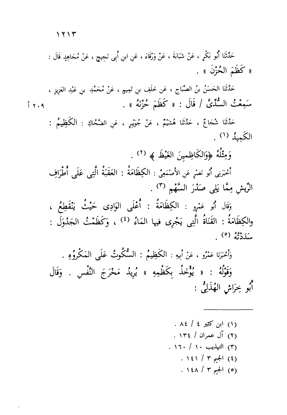 حَدَّثَنَا شُجَاعٌ، حَدَّثَنَا هُشَيْمٌ، عَنْ جُوَيْبِرٍ، عَنِ الضَّحَّاكِ: " §الْكَظِيمُ: الْكَمِيدُ " وَمِثْلُهُ: {وَالْكَاظِمِينَ الْغَيْظَ} [آل عمران: 134] أَخْبَرَنِي أَبُو نَصْرٍ عَنِ الْأَصْمَعِيِّ: الْكَظَامَةُ: الْعَقَبَةُ الَّتِي عَلَى أَطْرَافِ الرِّيشِ مِمَّا يَلِي صَدْرَ السَّهْمِ وَقَالَ أَبُو عَمْرٍو: الْكَظَامَةُ: أَعْلَى الْوَادِي حَيْثُ يَنْقَطِعُ، وَالْكِظَامَةُ: الْقَنَاةُ الَّتِي يَجْرِي فِيهَا الْمَاءُ، وَكَظَمْتُ الْجَدْوَلَ: سَدَدْتُهُ وَأَخْبَرَنَا عَمْرٌو، عَنْ أَبِيهِ: الْكَظِيمُ: السُّكُوتُ عَلَى الْمَكْرُوهِ وَقَوْلُهُ: «يُؤْخَذُ بِكَظْمِهِ» : يُرِيدُ مَخْرَجَ النَّفْسِ وَقَالَ أَبُو خِرَاشٍ الْهُذَلِيُّ: