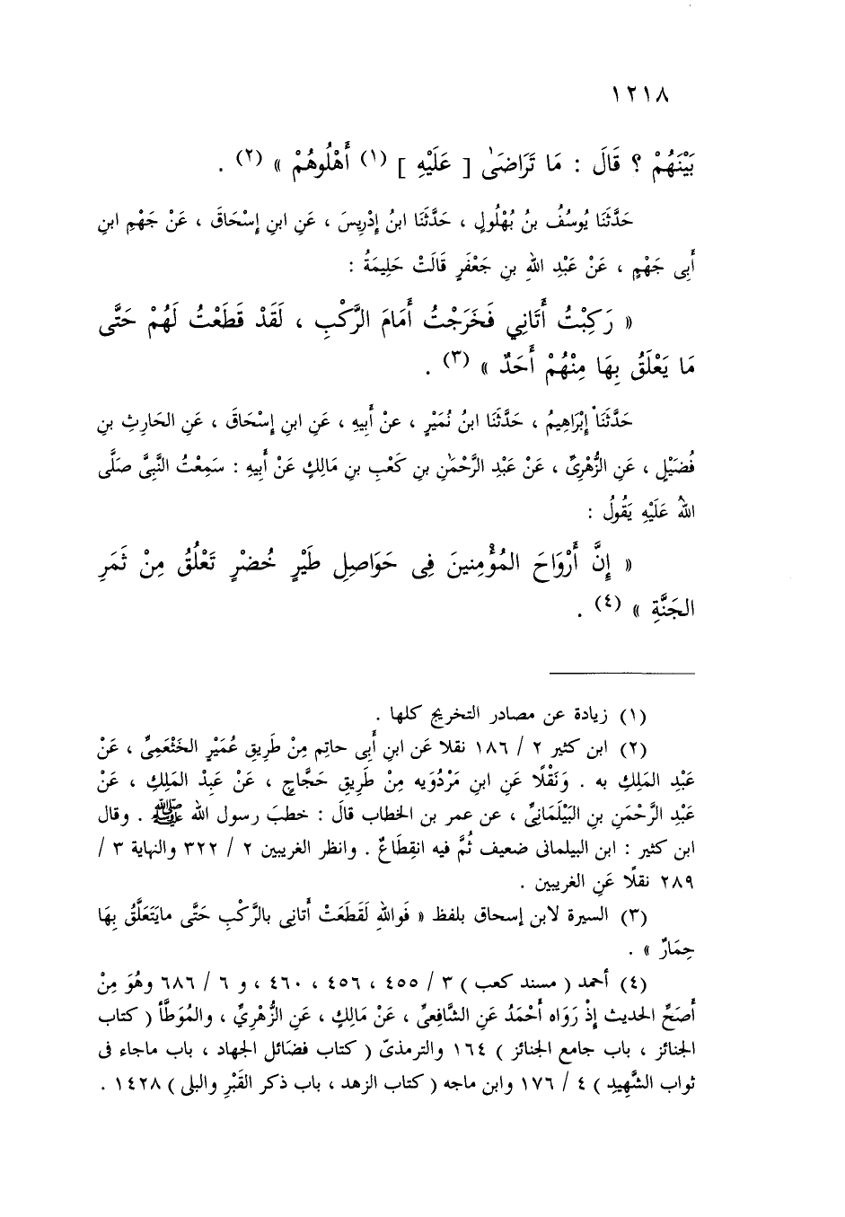 حَدَّثَنَا إِبْرَاهِيمُ، حَدَّثَنَا ابْنُ نُمَيْرٍ، عَنْ أَبِيهِ، عَنِ ابْنِ إِسْحَاقَ، عَنِ الْحَارِثِ بْنِ فُضَيْلٍ، عَنِ الزُّهْرِيِّ، عَنْ عَبْدِ الرَّحْمَنِ بْنِ كَعْبِ بْنِ مَالِكٍ، عَنْ أَبِيهِ: سَمِعْتُ النَّبِيَّ صَلَّى اللَّهُ عَلَيْهِ يَقُولُ: «إِنَّ أَرْوَاحَ الْمُؤْمِنِينَ فِي حَوَاصِلِ طَيْرٍ خُضْرٍ §تَعْلُقُ مِنْ ثَمَرِ الْجَنَّةِ»