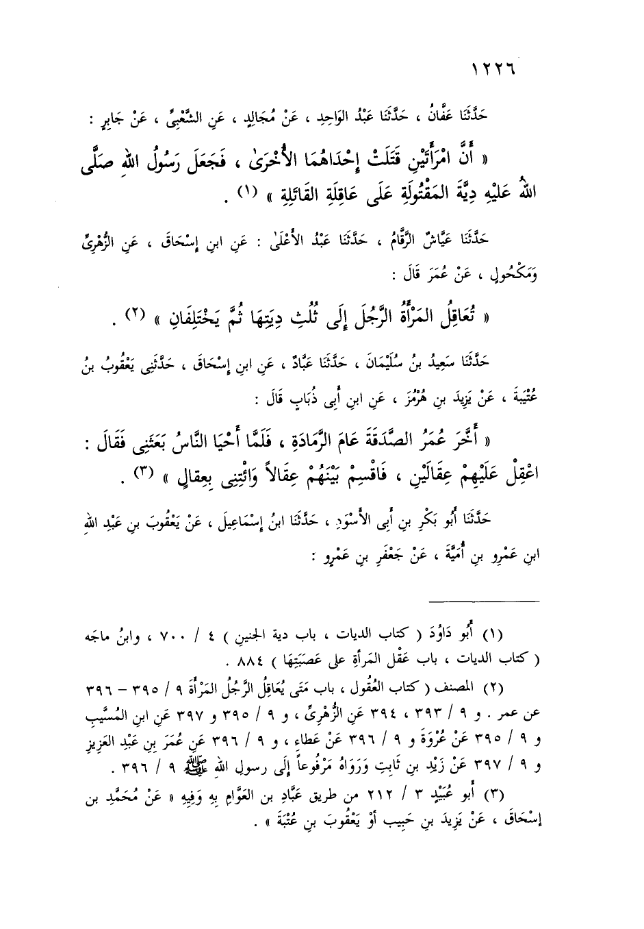 حَدَّثَنَا عَفَّانُ، حَدَّثَنَا عَبْدُ الْوَاحِدِ، عَنْ مُجَالِدٍ، عَنِ الشَّعْبِيِّ، عَنْ جَابِرٍ: «أَنَّ §امْرَأَتَيْنِ قَتَلَتْ إِحْدَاهُمَا الْأُخْرَى، فَجَعَلَ رَسُولُ اللَّهِ صَلَّى اللَّهُ عَلَيْهِ دِيَةَ الْمَقْتُولَةِ عَلَى عَاقِلَةِ الْقَاتِلَةِ»