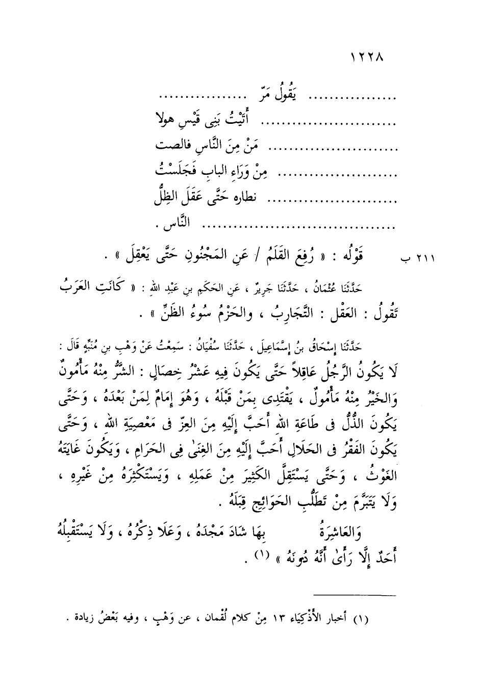 حَدَّثَنَا إِسْحَاقُ بْنُ إِسْمَاعِيلَ، حَدَّثَنَا سُفْيَانُ: سَمِعْتُ عَنَ وَهْبِ بْنِ مُنَبِّهٍ قَالَ: §لَا يَكُونُ الرَّجُلُ عَاقِلًا حَتَّى يَكُونَ فِيهِ عَشْرُ خِصَالٍ: الشَّرُّ مِنْهُ مَأْمُونٌ , وَالْخَيْرُ مِنْهُ مَأْمُولٌ، يَقْتَدِي بِمَنْ قَبْلَهُ، وَهُوَ إِمَامٌ لِمَنْ بَعْدَهُ، وَحَتَّى يَكُونَ الذُّلُّ فِي طَاعَةِ اللَّهِ أَحَبَّ إِلَيْهِ مِنَ الْعِزِّ فِي مَعْصِيَةِ اللَّهِ، وَحَتَّى يَكُونَ الْفَقْرُ فِي الْحَلَالِ أَحَبَّ إِلَيْهِ مِنَ الْغِنَى فِي الْحَرَامِ، وَيَكُونَ غَايَتَهُ الْغَوْثُ، وَحَتَّى يَسْتَقِلَّ الْكَثِيرَ مِنْ عَمَلِهِ، وَيَسْتَكْثِرَهُ مِنْ غَيْرِهِ، وَلَا يَتَبَرَّمَ مِنْ تَطَلُّبِ الْحَوَائِجِ قِبَلَهُ وَالْعَاشِرَةُ بِهَا شَادَ مَجْدَهُ، وَعَلَا ذِكْرُهُ، وَلَا يَسْتَقْبِلُهُ أَحَدٌ إِلَّا رَأَى أَنَّهُ دُونَهُ "