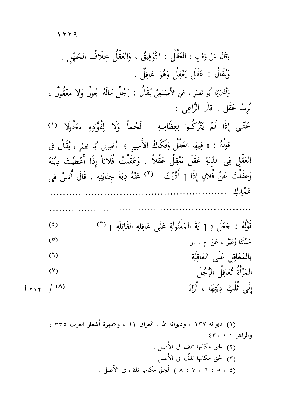 وَقَالَ عَنْ وَهْبٍ: §الْعَقْلُ: التَّوْفِيقُ، وَالْعَقْلُ خِلَافُ الْجَهْلِ " وَيُقَالُ: عَقَلَ يَعْقِلُ وَهُوَ عَاقِلٌ وَأَخْبَرَنَا أَبُو نَصْرٍ، عَنِ الْأَصْمَعِيِّ , يُقَالُ: رَجُلٌ مَالَهُ جُولٌ وَلَا مَعْقُولٌ: يُرِيدُ عَقْلٌ قَالَ الرَّاعِي: