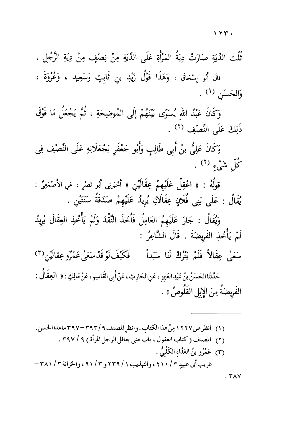 ثُلُثَ الدِّيَةِ صَارَتْ دِيَةَ الْمَرْأَةِ عَلَى الدِّيَةِ مِنْ نِصْفٍ مِنْ دِيَةِ الرَّجُلِ قَالَ أَبُو إِسْحَاقَ: وَهَذَا قَوْلُ زَيْدِ بْنِ ثَابِتٍ وَسَعِيدٍ، وَعُرْوَةَ، وَالْحَسَنِ وَكَانَ عَبْدُ اللَّهِ يُسَوِّي بَيْنَهُمْ إِلَى الْمُوضِحَةِ، ثُمَّ يَجْعَلُ مَا فَوْقَ ذَلِكَ عَلَى النِّصْفِ وَكَانَ عَلِيُّ بْنُ أَبِي طَالِبٍ وَأَبُو جَعْفَرٍ يَجْعَلَانِهِ عَلَى النِّصْفِ فِي كُلِّ شَيْءٍ قَوْلُهُ: «اعْقِلْ عَلَيْهِمْ عِقَالَيْنِ» أَخْبَرَنِي أَبُو نَصْرٍ، عَنِ الْأَصْمَعِيِّ: يُقَالُ: عَلَى بَنِي فُلَانٍ عِقَالَانِ: يُرِيدُ عَلَيْهِمْ صَدَقَةُ سَنَتَيْنِ وَيُقَالُ: جَارَ عَلَيْهِمُ الْعَامِلُ فَأَخَذَ النَّقْدَ وَلَمْ يَأْخُذِ الْعِقَالَ: يُرِيدُ لَمْ يَأْخُذِ الْفَرِيضَةَ قَالَ الشَّاعِرُ: