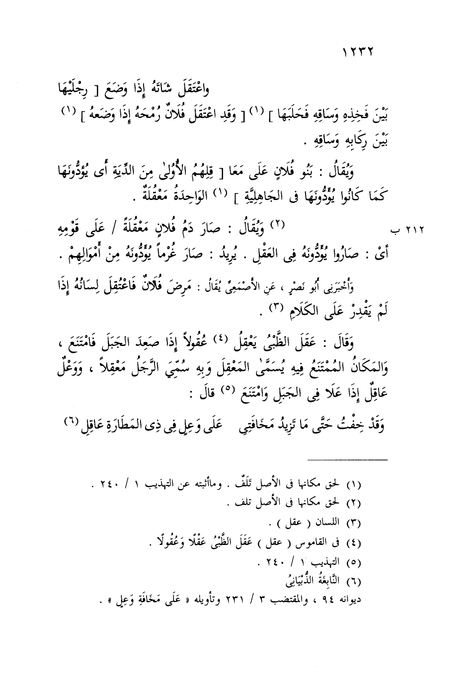 وَاعْتَقَلَ شَاتَهُ: إِذَا وَضَعَ رِجْلَيْهَا بَيْنَ فَخِذِهِ وَسَاقِهِ فَحَلَبَهَا , وَقَدِ اعْتَقَلَ فُلَانٌ رُمْحَهُ: إِذَا وَضَعَهُ بَيْنَ رِكَابِهِ وَسَاقِهِ وَيُقَالُ: بَنُو فُلَانٍ عَلَى مَعَاقِلِهِمُ الْأُولَى مِنَ الدِّيَةِ ,: أَيْ يُؤَدُّونَهَا كَمَا كَانُوا يُؤَدُّونَهَا فِي الْجَاهِلِيَّةِ , الْوَاحِدَةُ مَعْقُلَةٌ وَيُقَالُ: صَارَ دَمُ فُلَانٍ مَعْقُلَةً عَلَى قَوْمِهِ أَيْ: صَارُوا يُؤَدُّونَهُ فِي الْعَقْلِ , يُرِيدُ: صَارَ غُرْمًا يُؤَدُّونَهُ مِنْ أَمْوَالِهِمْ وَأَخْبَرَنِي أَبُو نَصْرٍ، عَنِ الْأَصْمَعِيِّ يُقَالُ: مَرِضَ فُلَانٌ فَاعْتُقِلَ لِسَانُهُ: إِذَا لَمْ يَقْدِرْ عَلَى الْكَلَامِ وَقَالَ: عَقَلَ الظَّبْيُ يَعْقِلُ عُقُولًا: إِذَا صَعِدَ الْجَبَلَ فَامْتَنَعَ، وَالْمَكَانُ الْمُمْتَنَعُ فِيهِ يُسَمَّى: الْمَعْقِلَ وَبِهِ سُمَيَّ الرَّجُلُ مَعْقِلًا، وَوَعْلٌ عَاقِلٌ: إِذَا عَلَا فِي الْجَبَلِ وَامْتَنَعَ قَالَ: