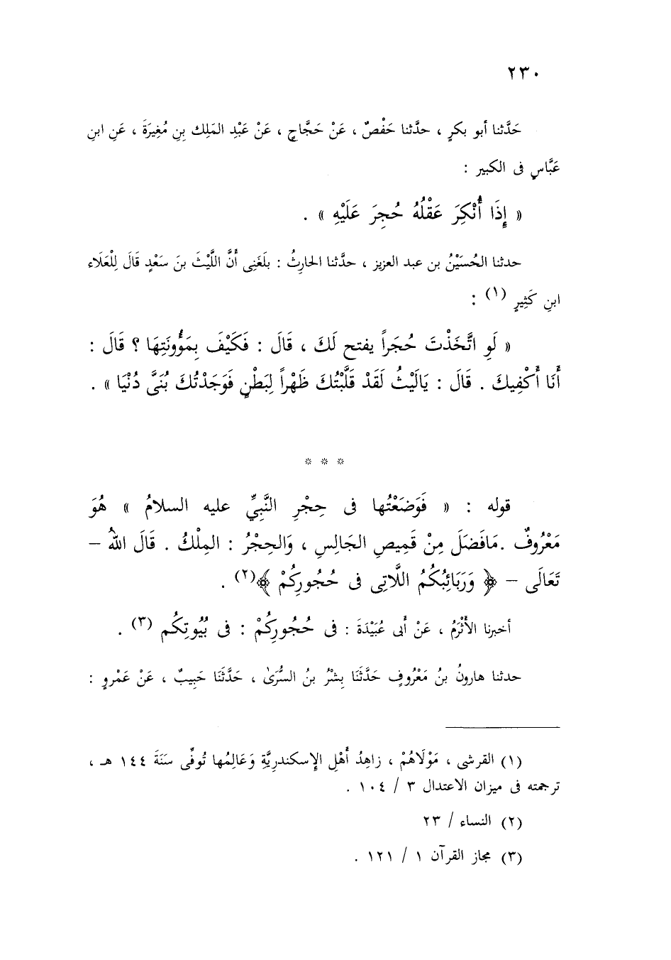 حَدَّثَنَا الْحُسَيْنُ بْنُ عَبْدِ الْعَزِيزِ , حَدَّثَنَا الْحَارِثُ , بَلَغَنِي أَنَّ اللَّيْثَ بْنَ سَعْدٍ , قَالَ لِلْعَلَاءِ بْنِ كَثِيرٍ: " لَوِ اتَّخَذْتَ حُجَرًا يُفْتَحُ لَكَ قَالَ: فَكَيْفَ بِمَؤُنَتِهَا؟ قَالَ: أَنَا أَكْفِيكَ قَالَ: يَا لَيْثُ §لَقَدْ قَلَّبْتُكَ ظَهْرًا لِبَطْنٍ فَوَجَدْتُكَ بُنَيَّ دُنْيَا " قَوْلُهُ: فَوَضَعْتُهَا فِي حِجْرِ النَّبِيِّ عَلَيْهِ السَّلَامُ , هُوَ مَعْرُوفٌ , مَا فَضَلَ مِنْ قَمِيصِ الْجَالِسِ وَالْحِجْرُ: الْمِلْكُ قَالَ اللَّهُ - تَعَالَى - {وَرَبَائِبُكُمُ اللَّاتِي فِي حُجُورِكُمْ} [النساء: 23]