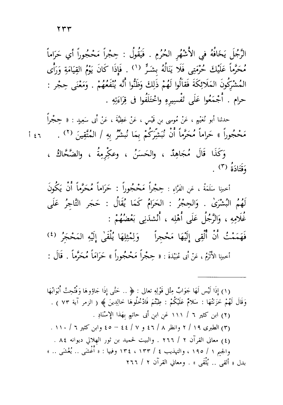 الرَّجُلَ يَخَافُهُ فِي الْأَشْهُرِ الْحُرُمِ , فَيَقُولُ: {حِجْرًا مَحْجُورًا} [الفرقان: 22] أَيْ حَرَامًا مُحَرَّمًا عَلَيْكَ حُرْمَتِي فَلَا يَنَالُهُ بَشَرٌ فَإِذَا كَانَ يَوْمُ الْقِيَامَةِ , وَرَأَى الْمُشْرِكُونَ الْمَلَائِكَةَ , فَقَالُوا لَهُمْ ذَلِكَ وَظَنُّوا أَنَّهُ يَنْفَعُهُمْ وَمَعْنَى حِجْرٌ: حَرَامٌ , أَجْمَعُوا عَلَى تَفْسِيرِهِ , وَاخْتَلَفُوا فِي قِرَاءَتِهِ