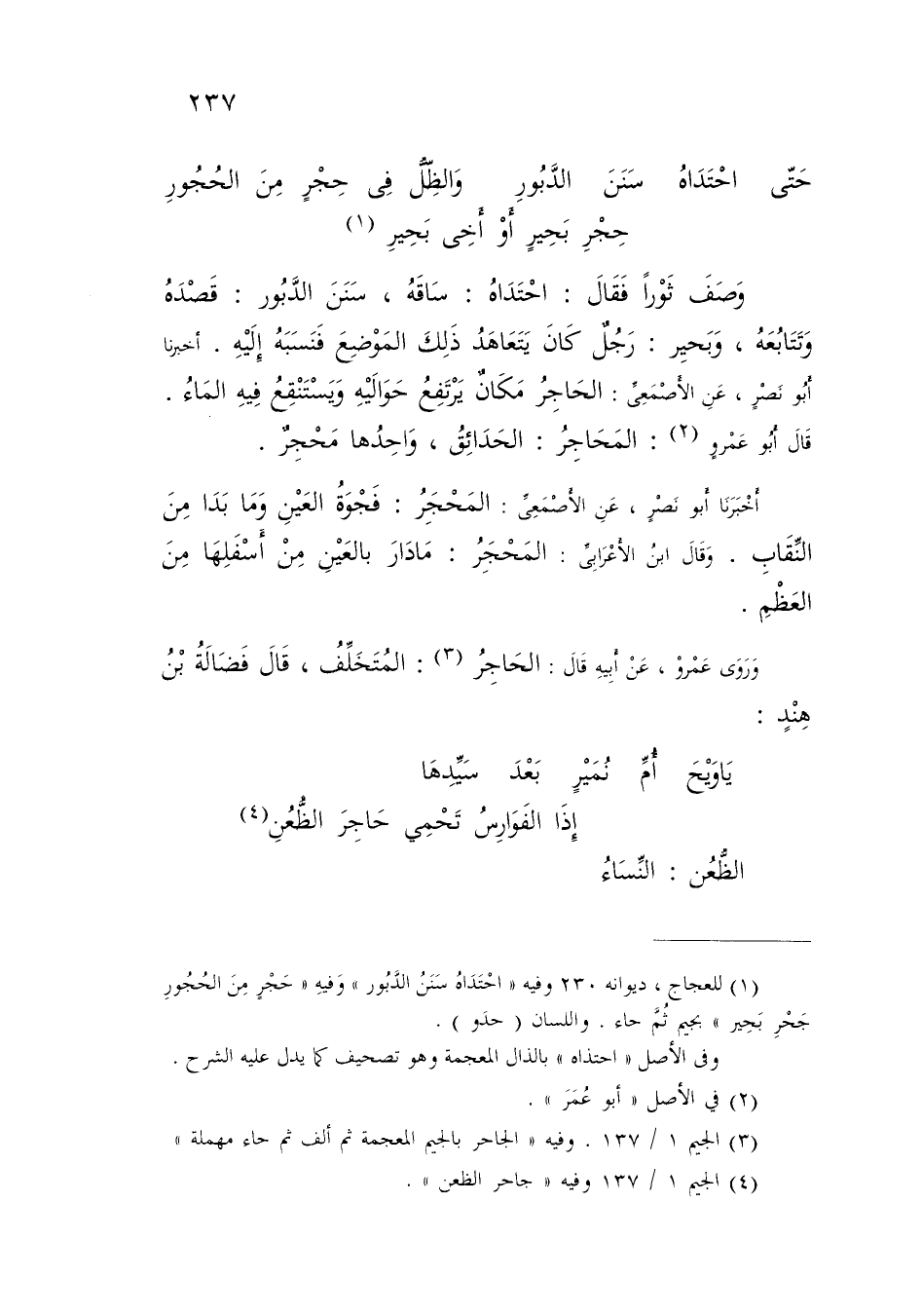وَصَفَ ثَوْرًا , فَقَالَ: احْتَدَاهُ: سَاقَهُ سَنَنَ الدَّبُورِ: قَصْدَهُ وَتَتَابُعَهُ , وَبَحِيرٌ: رَجُلٌ كَانَ يَتَعَاهَدُ ذَلِكَ الْمَوْضِعَ فَنَسَبَهُ إِلَيْهِ أَخْبَرَنَا أَبُو نَصْرٍ , عَنِ الْأَصْمَعِيِّ: الْحَاجِرُ: مَكَانٌ يَرْتَفِعُ حَوَالَيْهِ , وَيَسْتَنْقِعُ فِيهِ الْمَاءُ قَالَ أَبُو عَمْرٍو: الْمَحَاجِرُ: الْحَدَائِقُ , وَاحِدُهَا مَحْجِرٌ أَخْبَرَنَا أَبُو نَصْرٍ , عَنِ الْأَصْمَعِيِّ: الْمَحْجَرُ: فَجْوَةُ الْعَيْنِ , وَمَا بَدَا مِنَ النِّقَابِ وَقَالَ ابْنُ الْأَعْرَابِيِّ: الْمَحْجَرُ: مَا دَارَ بِالْعَيْنِ مِنْ أَسْفَلِهَا مِنَ الْعَظْمِ وَرَوَى عَمْرٌو , عَنْ أَبِيهِ قَالَ: الْحَاجِرُ: الْمُتَخَلِّفُ , قَالَ فَضَالَةُ بْنُ هِنْدَ: