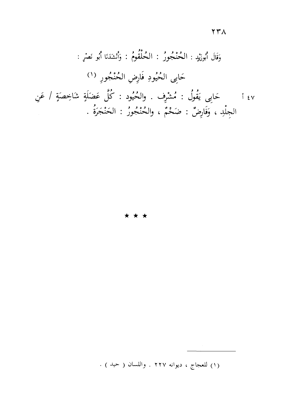 حَابِي يَقُولُ: مُشْرِفٌ وَالحْيُودُ: كُلُّ عَضَلَةٍ شَاخِصَةٍ عَنِ الْجِلْدِ وَفَارِضٌ: ضَخْمٌ وَالْحُنْجُورُ: الْحَنْجَرَةُ