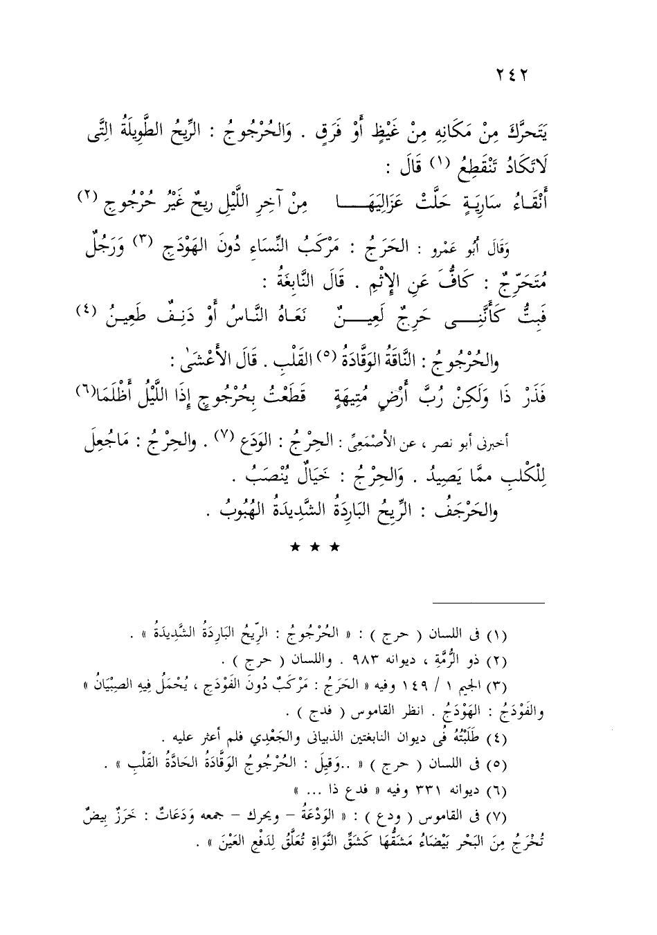 أَنْقَاءُ سَارِيَةٍ حَلَّتْ عَزَالِيَهَا مِنْ آخِرِ اللَّيْلِ رِيحٌ غَيْرُ حُرْجُوجِ وَقَالَ أَبُو عَمْرٍو: الْحَرَجُ: مَرْكَبُ النِّسَاءِ دُونَ الْهَوْدَجِ , وَرَجُلٌ مُتَحَرِّجٌ: كَافٌّ عَنِ الْإِثْمِ , قَالَ النَّابِغَةُ: