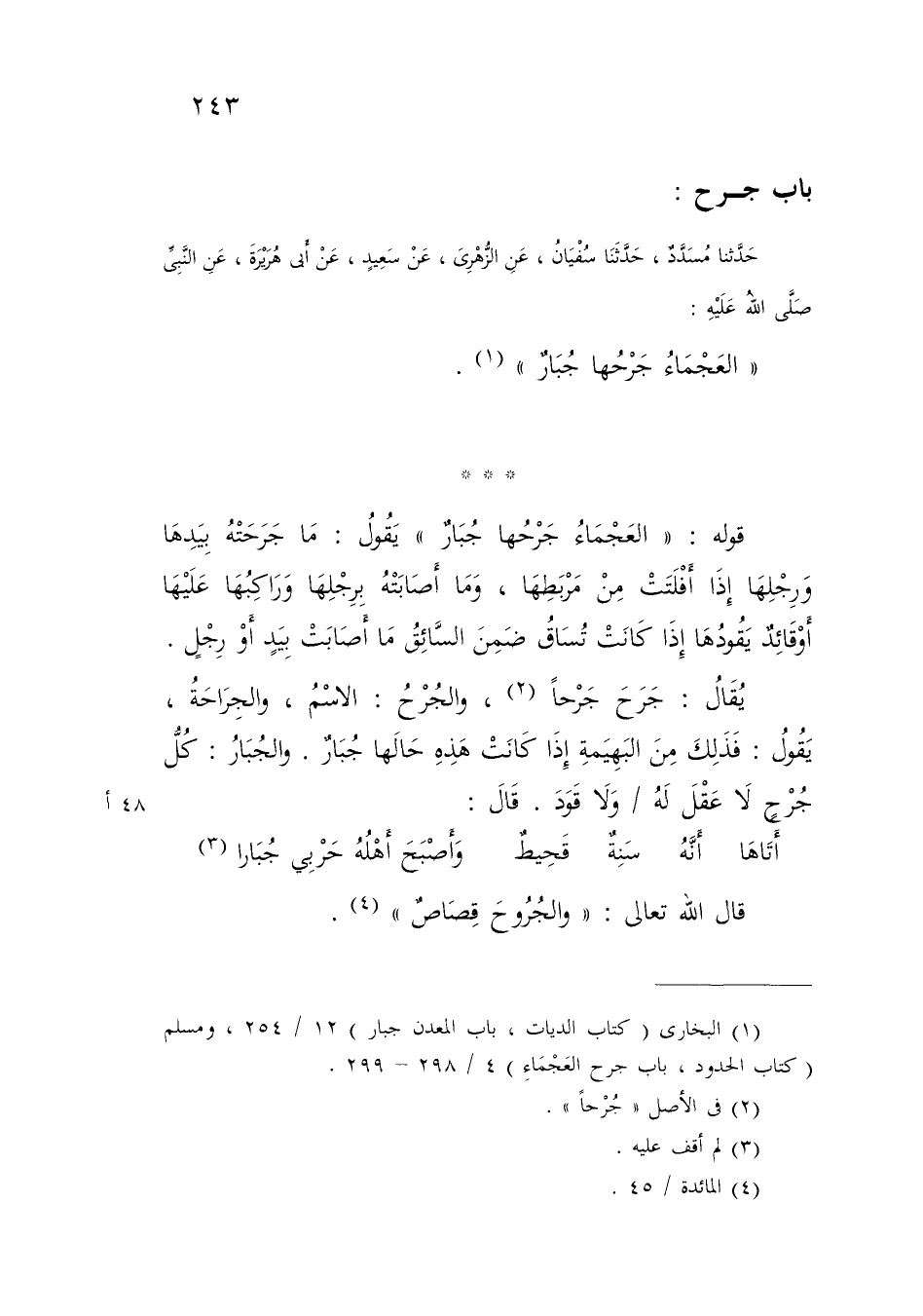 حَدَّثَنَا مُسَدَّدٌ , حَدَّثَنَا سُفْيَانُ , عَنِ الزُّهْرِيِّ , عَنْ سَعِيدٍ , عَنْ أَبِي هُرَيْرَةَ , عَنِ النَّبِيِّ صَلَّى اللَّهُ عَلَيْهِ: «§الْعَجْمَاءُ جَرْحُهَا جُبَارٌ» قَوْلُهُ: «الْعَجْمَاءُ جَرْحُهَا جُبَارٌ» يَقُولُ: مَا جَرَحَتْهُ بِيَدِهَا , وَرِجْلِهَا إِذَا أَفْلَتَتْ مِنْ مَرْبَطِهَا , وَمَا أَصَابَتْهُ بِرِجْلِهَا وَرَاكِبُهَا عَلَيْهَا أَوْ قَائِدٌ يَقُودُهَا إِذَا كَانَتْ تُسَاقُ ضَمِنَ السَّائِقُ مَا أَصَابَتْ بِيَدٍ أَوْ رِجْلٍ يُقَالُ: جَرَحَ جَرْحًا , وَالْجُرْحُ: الِاسْمُ , وَالْجِرَاحَةُ , يَقُولُ: فَذَلِكَ مِنَ الْبَهِيمَةِ إِذَا كَانَتْ هَذِهِ حَالَهَا جُبَارٌ وَالْجُبَارُ: كُلُّ جُرْحٍ لَا عَقْلَ لَهُ , وَلَا قَوَدَ قَالَ: