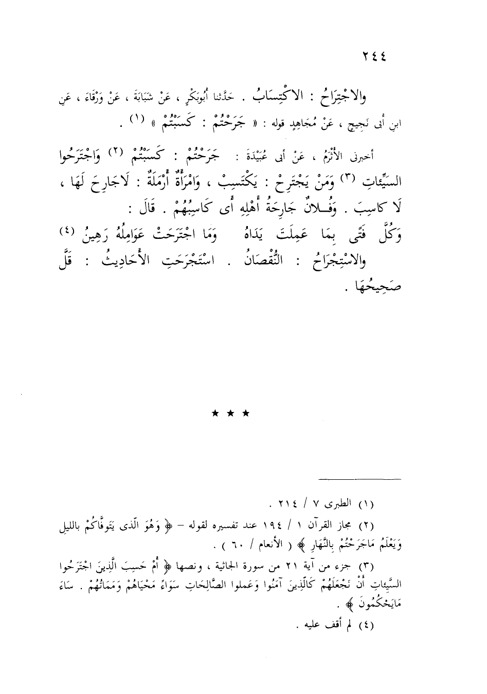 حَدَّثَنَا أَبُو بَكْرٍ , عَنْ شَبَابَةَ , عَنْ وَرْقَاءَ , عَنِ ابْنِ أَبِي نَجِيحٍ , عَنْ مُجَاهِدٍ , قَوْلُهُ: " {§جَرَحْتُمْ} [الأنعام: 60] : كَسَبْتُمْ "