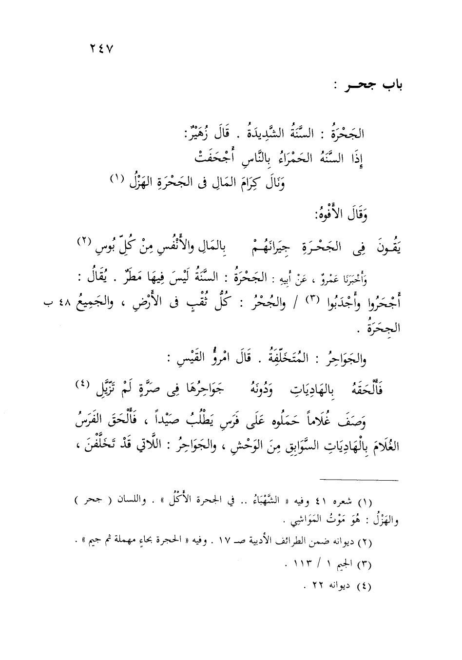 وَأَخْبَرَنَا عَمْروٌ، عَنْ أَبِيهِ: الْجَحْرَةُ: السَّنَةُ لَيْسَ فِيهَا مَطَرٌ، يُقَالُ: أَجْحَرُوا وَأَجْدَبُوا، وَالْجُحْرُ: كُلُّ ثُقْبٍ فِي الْأَرْضِ، وَالْجَمِيعُ الْجِحَرَةُ، وَالْجَوَاحِرُ: الْمُتَخَلِّفَةُ قَالَ امْرُؤُ الْقَيْسِ: