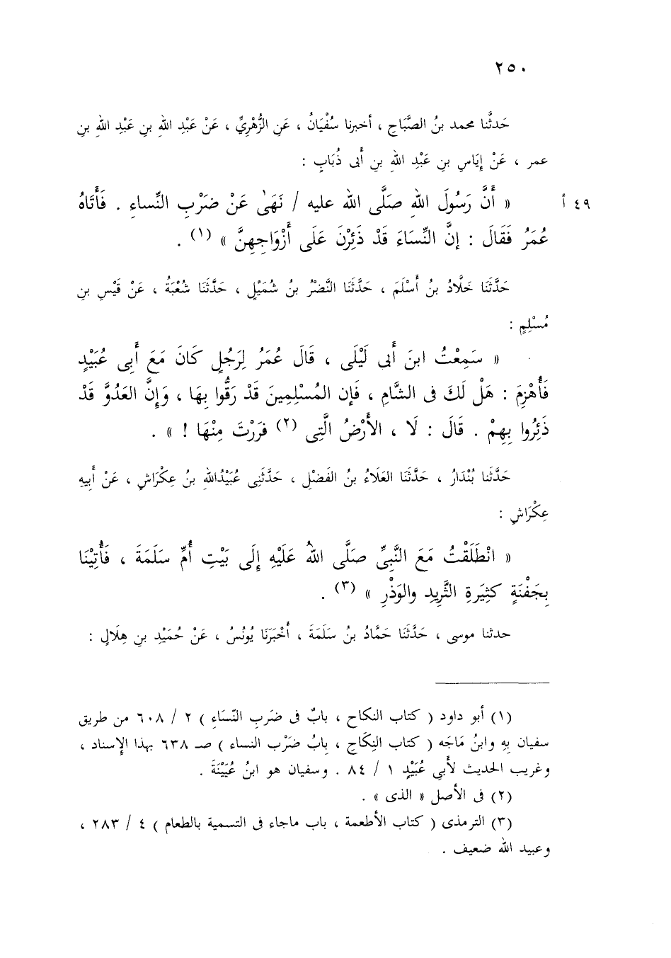 حَدَّثَنَا مُحَمَّدُ بْنُ الصَّبَّاحِ , أَخْبَرَنَا سُفْيَانُ , عَنِ الزُّهْرِيِّ , عَنْ عَبْدِ اللَّهِ بْنِ عَبْدِ اللَّهِ بْنِ عُمَرَ , عَنْ إِيَاسِ بْنِ عَبْدِ اللَّهِ بْنِ أَبِي ذُبَابٍ , " أَنَّ رَسُولَ اللَّهِ صَلَّى اللَّهُ عَلَيْهِ , §نَهَى عَنْ ضَرْبِ النِّسَاءِ , فَأَتَاهُ عُمَرُ , فَقَالَ: إِنَّ النِّسَاءَ قَدْ ذَئِرْنَ عَلَى أَزْوَاجِهِنَّ "