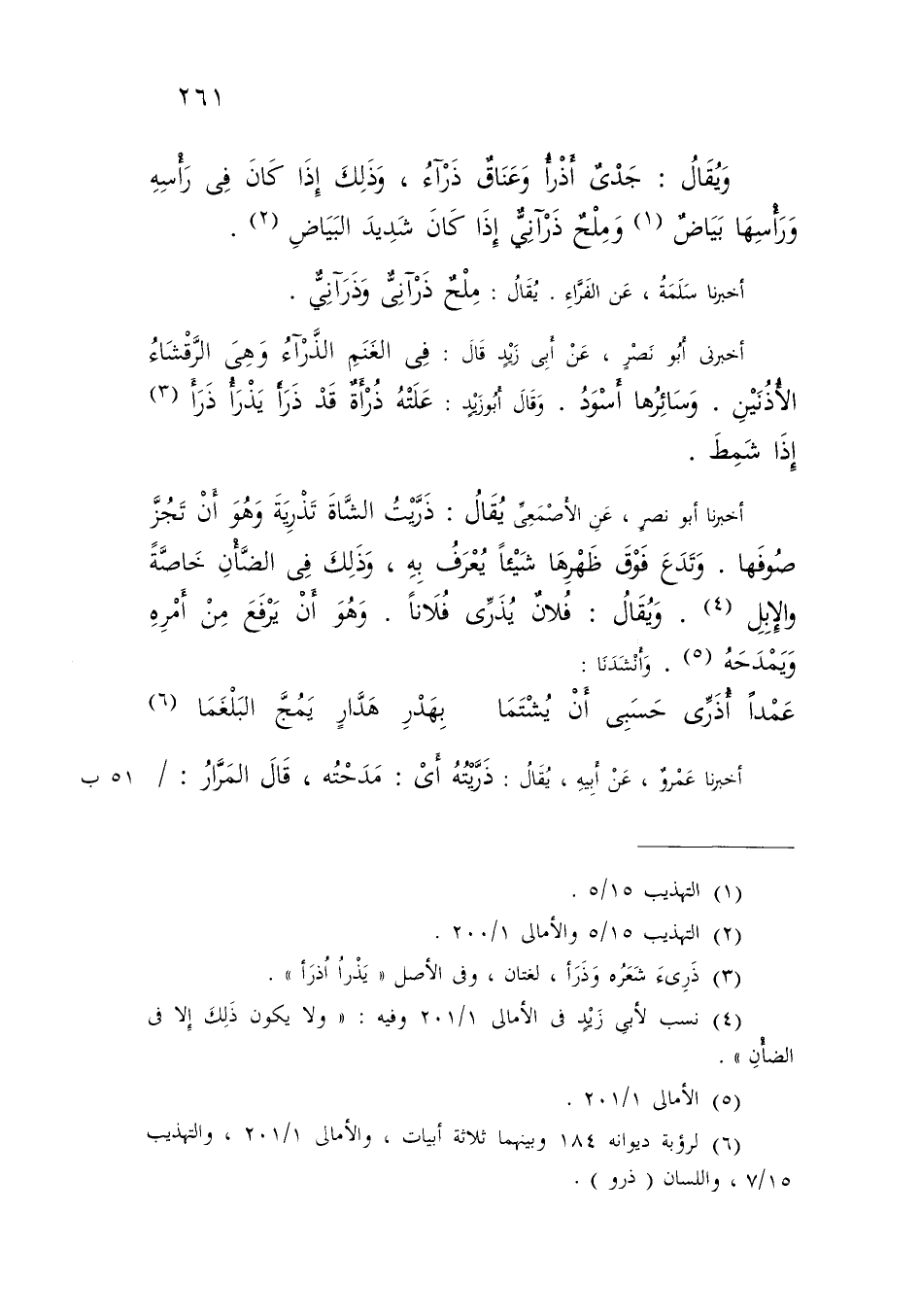 وَيُقَالُ: جَدْيٌ أَذْرَأُ وَعَنَاقٌ ذَرْآءُ , وَذَلِكَ إِذَا كَانَ فِي رَأْسِهِ وَرَأْسِهَا بَيَاضٌ , وَمِلْحٌ ذَرْآنِيٌّ إِذَا كَانَ شَدِيدَ الْبَيَاضِ أَخْبَرَنَا سَلَمَةُ , عَنِ الْفَرَّاءِ: يُقَالُ: مِلْحٌ ذَرْآنِيٌّ , وَذَرَآنِيٌّ أَخْبَرَنِي أَبُو نَصْرٍ , عَنْ أَبِي زَيْدٍ قَالَ: فِي الْغَنَمِ الذَّرْآءُ , وَهِيَ الرَّقْشَاءُ الْأُذُنَيْنِ , وَسَائِرُهَا أَسْوَدُ وَقَالَ أَبُو زَيْدٍ: عَلَتْهُ ذُرْأَةٌ , قَدْ ذَرَأَ يَذْرَأُ ذَرَأَ إِذَا شَمِطَ أَخْبَرَنَا أَبُو نَصْرٍ , عَنِ الْأَصْمَعِيِّ , يُقَالُ: ذَرَّيْتُ الشَّاةَ تَذْرِيَةً , وَهُوَ أَنْ تَجُزَّ صُوفَهَا , وَتَدَعَ فَوْقَ ظَهْرِهَا شَيْئًا يُعْرَفُ بِهِ , وَذَلِكَ فِي الضَّأْنِ خَاصَّةً , وَالْإِبِلِ , وَيُقَالُ: فُلَانٌ يُذَرِّي فُلَانًا , وَهُوَ أَنْ يَرْفَعَ مِنْ أَمْرِهِ , وَيَمْدَحُهُ , وَأَنْشَدَنَا: