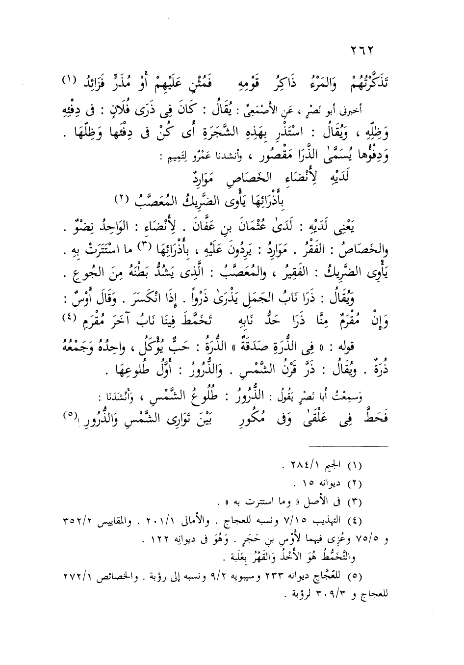 يَعْنِي لَدَيْهِ: لَدَى عُثْمَانَ بْنِ عَفَّانَ , لِأَنْضَاءِ: الْوَاحِدُ نِضْوٌ وَالْخَصَاصُ: الْفَقْرُ , مَوَارِدُ: يَرِدُونَ عَلَيْهِ بِأَذْرَائِهَا: مَا اسْتَتَرَتْ بِهِ , يَأْوِي الضَّرِيكُ: الْفَقِيرُ وَالْمُعَصَّبُ: الَّذِي يَشُدُّ بَطْنَهُ مِنَ الْجُوعِ وَيُقَالُ: ذَرَا نَابُ الْجَمَلِ يَذْرَى ذَرْوًا , إِذَا انْكَسَرَ وَقَالَ أَوْسٌ: