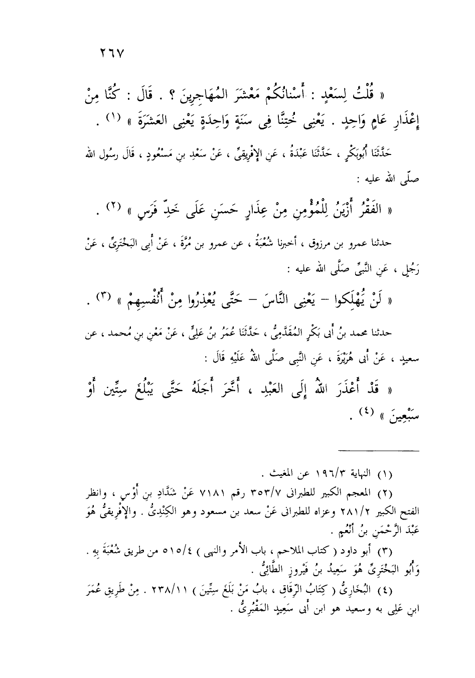 حَدَّثَنَا أَبُو بَكْرٍ , حَدَّثَنَا عَبْدَةُ , عَنِ الْإِفْرِيقِيِّ , عَنْ سَعْدِ بْنِ مَسْعُودٍ قَالَ رَسُولُ اللَّهِ صَلَّى اللَّهُ عَلَيْهِ: «§الْفَقْرُ أَزْيَنُ لِلْمُؤْمِنِ مِنْ عِذَارٍ حَسَنٍ عَلَى خَدِّ فَرَسٍ»