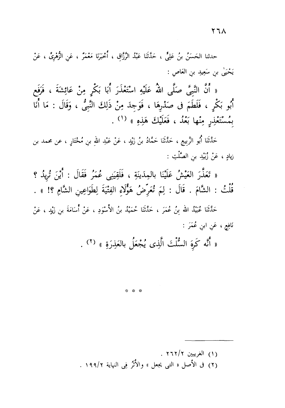 حَدَّثَنَا الْحَسَنُ بْنُ عَلِيٍّ , حَدَّثَنَا عَبْدُ الرَّزَّاقِ , أَخْبَرَنَا مَعْمَرٌ , عَنِ الزُّهْرِيِّ , عَنْ يَحْيَى بْنِ سَعِيدِ بْنِ الْعَاصِ , أَنَّ النَّبِيَّ صَلَّى اللَّهُ عَلَيْهِ اسْتَعْذَرَ أَبَا بَكْرٍ مِنْ عَائِشَةَ , فَرَفَعَ أَبُو بَكْرٍ , فَلَطَمَ فِي صَدْرِهَا , فَوَجَدَ مِنْ ذَلِكَ النَّبِيُّ , وَقَالَ: «§مَا أَنَا بِمُسْتَعْذِرٍ مِنْهَا بَعْدَ فِعْلَتِكَ هَذِهِ»