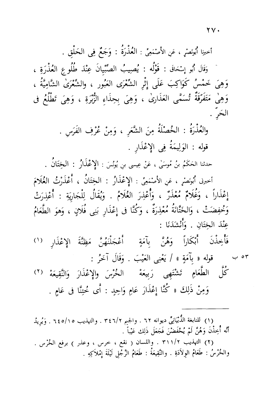 أَخْبَرَنَا أَبُو نَصْرٍ , عَنِ الْأَصْمَعِيِّ: الْعُذْرَةُ: وَجَعٌ فِي الْحَلْقِ وَقَالَ أَبُو إِسْحَاقَ: " قَوْلُهُ: يُصِيبُ الصِّبْيَانَ عِنْدَ طُلُوعِ الْعُذْرَةَ , وَهِيَ خَمْسُ كَوَاكِبَ عَلَى إِثْرِ الشِّعْرَى؛ الْعَبُورِ , وَالشِّعْرَى الشَّامِيَّةِ وَهِيَ مُتَفَرِّقَةٌ تُسَمَّى الْعَذَارَى , وَهِيَ بِحِذَاءِ الزُّبْرَةِ , وَهِيَ تَطْلُعُ فِي الْحَرِّ. وَالْعُذْرَةُ: الْخُصْلَةُ مِنَ الشَّعْرِ , وَمِنْ عُرْفِ الْفَرَسِ قَوْلُهُ: «الْوَلِيمَةُ فِي الْإِعْذَارِ» حَدَّثَنَا الْحَكَمُ بْنُ مُوسَى , عَنْ عِيسَى بْنِ يُونُسَ: الْإِعْذَارُ: الْخِتَانُ أَخْبَرَنِي أَبُو نَصْرٍ , عَنِ الْأَصْمَعِيِّ: الْإِعْذَارُ: الْخِتَانُ , أَعْذَرَتِ الْغُلَامَ إِعْذَارًا , وَغُلَامٌ مُعْذَرٌ , وَأُعْذِرَ الْغُلَامُ , وَيُقَالُ لِلْجَارِيَةِ: أُعْذِرَتْ وَخُفِضَتْ , وَالْخِتَانَةُ مَعْذِرَةٌ , وَكُنَّا فِي إِعْذَارِ بَنِي فُلَانٍ , وَهُوَ الطَّعَامُ عِنْدَ الْخِتَانِ. وَأَنْشَدَنَا: