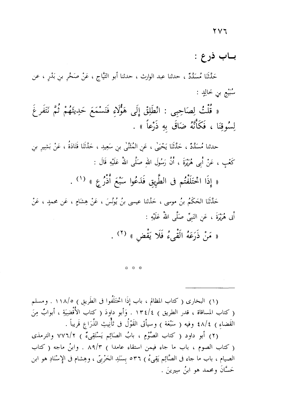 حَدَّثَنَا مُسَدَّدٌ , حَدَّثَنَا عَبْدُ الْوَارِثِ , حَدَّثَنَا أَبُو التَّيَّاحِ , عَنْ صَخْرِ بْنِ بَدْرٍ , عَنْ سُبَيْعِ بْنِ خَالِدٍ , قُلْتُ لِصَاحِبِي: «انْطَلِقْ إِلَى هَؤُلَاءِ , فَنَسْمَعَ حَدِيثَهُمْ ثُمَّ نَتَفَرَّغَ لِسُوقِنَا , فَكَأَنَّهُ §ضَاقَ بِهِ ذَرْعًا»