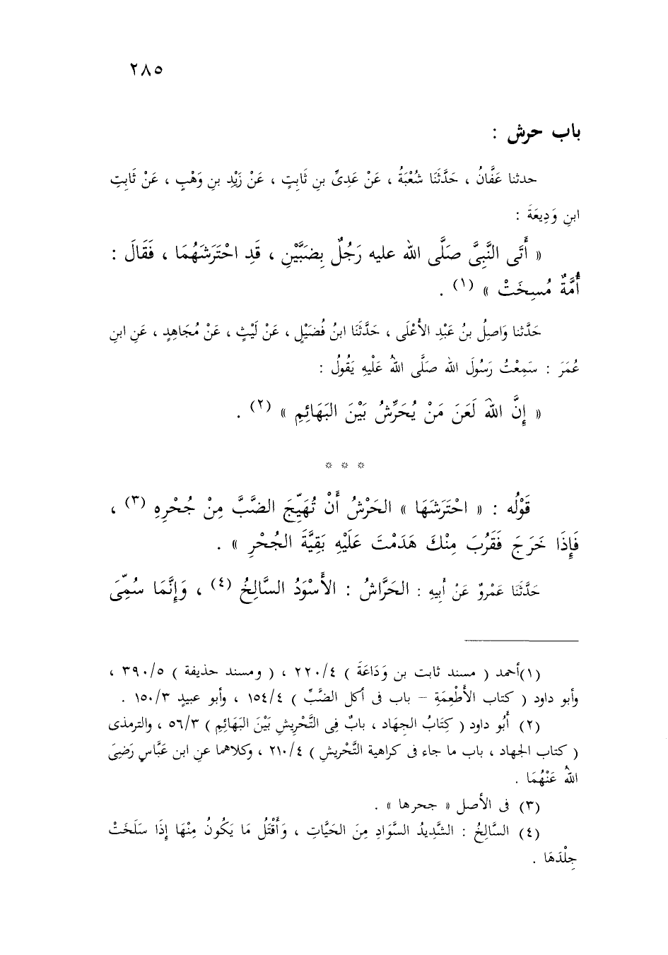 حَدَّثَنَا وَاصِلُ بْنُ عَبْدِ الْأَعْلَى , حَدَّثَنَا ابْنُ فُضَيْلٍ , عَنْ لَيْثٍ , عَنْ مُجَاهِدٍ , عَنِ ابْنِ عُمَرَ: سَمِعْتُ رَسُولَ اللَّهِ صَلَّى اللَّهُ عَلَيْهِ يَقُولُ: «إِنَّ اللَّهَ §لَعَنَ مَنْ يُحَرِّشُ بَيْنَ الْبَهَائِمِ» قَوْلُهُ: «احْتَرَشَهَا» الْحَرْشُ: أَنْ تُهَيِّجَ الضَّبَّ مِنْ جُحْرِهِ , فَإِذَا خَرَجَ فَقَرُبَ مِنْكَ هَدَمْتَ عَلَيْهِ بَقِيَّةَ الْجُحْرِ حَدَّثَنَا عَمْرٌو , عَنْ أَبِيهِ: الْحَرَّاشُ: الْأَسْوَدُ السَّالِخُ , وَإِنَّمَا سُمِّيَ -[286]- الْحَرَّاشَ؛ لِأَنَّهُ يَحْرِشُ الضِّبَابَ , وَقَدْ أَحْرَشَ الضَّبُّ: وَهُوَ أَنْ يَدْنُوَ وَيَضْرِبَ بِذَنَبِهِ وَيَفِحَّ وَكَانَ الضَّبُّ , إِذَا وَلَدَ يُحَذِّرُ وَلَدَهُ الْإِنْسَانَ , وَيَقُولُ: احْذَرِ الْحَرْشَ , فَبَيْنَا هُوَ وَابْنُهُ فِي تَلْعَةٍ إِذْ وَجَدَ الْإِنْسَانُ أَثَرَ الضَّبِّ فِي التَّلْعَةِ , فَأَخَذَ مِرْدَاةً فَعَلِقَ التَّلْعَةَ رَدْيًا , فَقَالَ: يَا أَبَهِ الْحَرْشُ هَذَا؟ قَالَ: يَا بُنَيَّ هَذَا أَجَلُّ مِنَ الْحَرْشِ , فَأَذْهَبَهَا مَثَلًا الْمِرْدَاةُ: يَعْنِي الْحَجَرَ أَخْبَرَنِي أَبُو نَصْرٍ , عَنِ الْأَصْمَعِيِّ: الْحَرْشَاءُ: خَرْدَلُ الْبُرِّ وَالْحَرْشُ: الْأَثَرُ وَجِمَاعُهُ حِرَاشٌ قَوْلُهُ: «نَهَى عَنِ التَّحْرِيشِ بَيْنَ الْبَهَائِمِ» , أَنْ يُغْرِيَ بَهِيمَةً بِبَهِيمَةٍ , أَوْ إِنْسَانًا بِإِنْسَانٍ وَالْحَرِيشُ: دَابَّةٌ لَهَا مَخَالِبُ كَمَخَالِبِ الْأَسَدِ