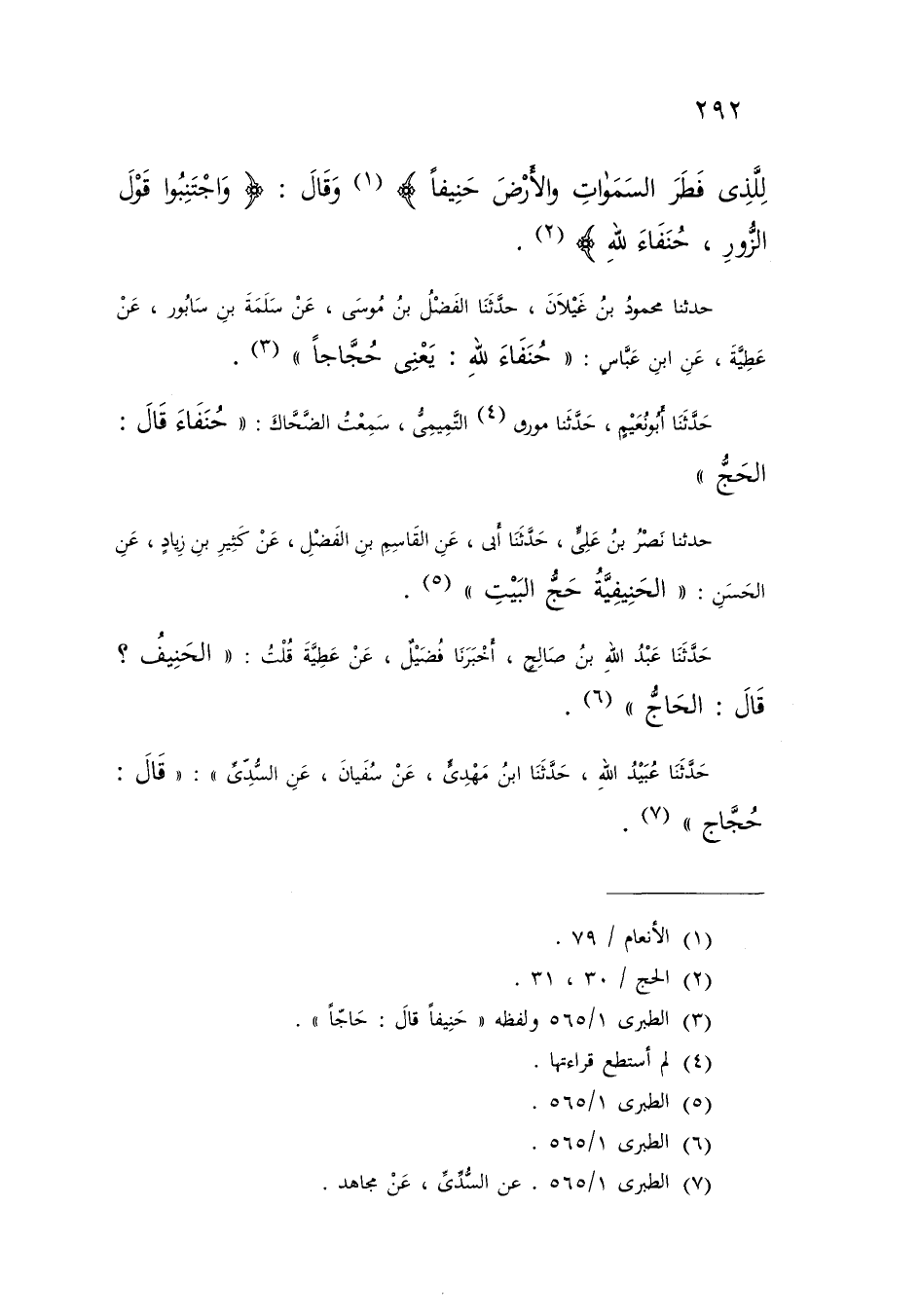حَدَّثَنَا مَحْمُودُ بْنُ غَيْلَانَ , حَدَّثَنَا الْفَضْلُ بْنُ مُوسَى , عَنْ سَلَمَةَ بْنِ سَابُورَ , عَنْ عَطِيَّةَ , عَنِ ابْنِ عَبَّاسٍ: " {§حُنَفَاءَ لِلَّهِ} [الحج: 31] يَعْنِي حُجَّاجًا "