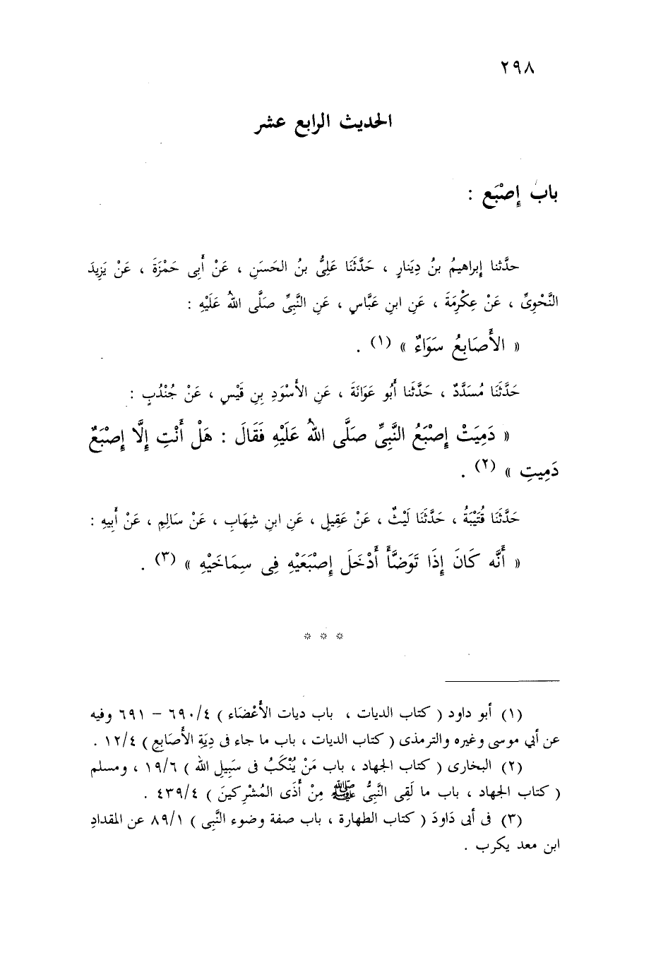 حَدَّثَنَا قُتَيْبَةُ , حَدَّثَنَا لَيْثٌ , عَنِ عَقِيلٍ، عَنِ ابْنِ شِهَابٍ , عَنْ سَالِمٍ , عَنْ أَبِيهِ , «§أَنَّهُ كَانَ إِذَا تَوَضَّأَ أَدْخَلَ إِصْبَعَيْهِ فِي سِمَاخَيْهِ» -[299]- أَخْبَرَنِي أَبُو نَصْرٍ عَنِ الْأَصْمَعِيِّ: الْأَصَابِعُ: الْوَاحِدَةُ إِصْبَعٌ لِلْيَدِ سَمِعْتُ قُطْرُبًا , يُقَالُ: إِصْبَعٌ وَأُصْبُعٌ وَأَصْبَعٌ. قَالَ أَبُو إِسْحَاقَ: وَقَدْ ذُكِرَ مِنَ اسْمِ الْإِصْبُعِ أَكْثَرُ مِنْ هَذَا أَخْبَرَنَا سَلَمَةُ , عَنِ الْفَرَّاءِ: هِيَ الْإِصْبَعُ. أَخْبَرَنِي أَبُو نَصْرٍ , عَنِ الْأَصْمَعِيِّ: الْإِصْبَعُ: الْأَثَرُ الْحَسَنُ مِنَ الرَّجُلِ عَلَى عَمَلٍ عَمِلَهُ , فَأَحْسَنَ الْعَمَلَ , أَوْ مَعْرُوفٍ , يُقَالُ: مَا أَحْسَنَ إِصْبَعَ فُلَانٍ عَلَى فُلَانٍ وَقَالَ أَبُو عَمْرٍو: إِنَّهُ لَحَسَنُ الْإِصْبَعِ فِي الْمَالِ: إِذَا كَانَ حَسَنَ الْقِيَامِ عَلَيْهِ , وَإِنَّهُ لَذُو إِصْبَعٍ فِي الْمَالِ. وَأَنْشَدَنَا:
