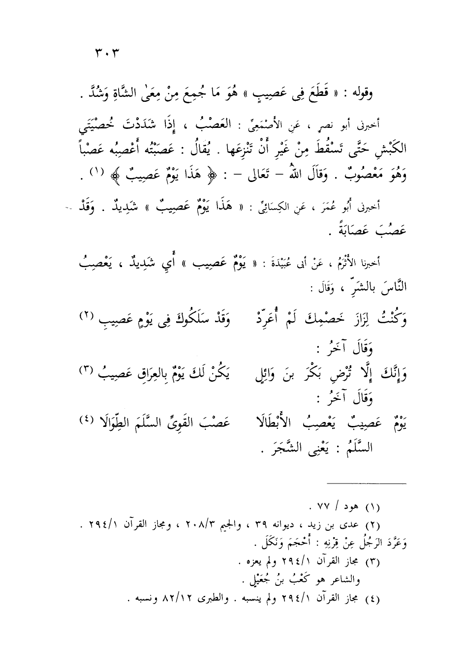 أَخْبَرَنِي أَبُو عُمَرَ , عَنِ الْكِسَائِيِّ: " {§هَذَا يَوْمٌ عَصِيبٌ} [هود: 77] شَدِيدٌ , وَقَدْ عَصُبَ عُصَابَةً "
