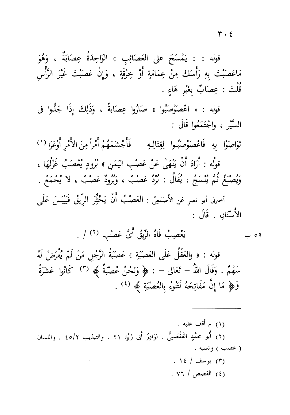 قَوْلُهُ: «أَرَادَ أَنْ يَنْهَى عَنْ عَصَبِ الْيَمَنِ» بُرُودٌ يُعْصَبُ غَزْلُهَا وَيُصْبَغُ ثُمَّ يُنْسَجُ , يُقَالُ: بُرْدٌ عَصْبٌ , وَبُرُودٌ عَصْبٌ , لَا يُجْمَعُ أَخْبَرَنِي أَبُو نَصْرٍ , عَنِ الْأَصْمَعِيِّ: الْعَصْبُ: أَنْ يَخْثُرَ الرِّيقُ فَيَيْبَسَ عَلَى الْأَسْنَانِ. قَالَ: يَعْصِبُ فَاهُ الرِّيقُ أَيَّ عَصْبٍ قَوْلُهُ: «وَالْعَقْلُ عَلَى الْعَصَبَةِ» عَصَبَةُ الرَّجُلِ: مَنْ لَمْ يُفْرَضْ لَهُ سَهْمٌ. وَقَالَ اللَّهُ تَعَالَى {وَنَحْنُ عُصْبَةٌ} [يوسف: 14] كَانُوا عَشَرَةً , وَ {مَا إِنَّ مَفَاتِحَهُ لَتَنُوءُ بِالْعُصْبَةِ} [القصص: 76]