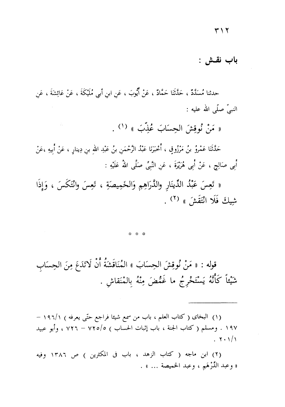 حَدَّثَنَا عَمْرُو بْنُ مَرْزُوقٍ , أَخْبَرَنَا عَبْدُ الرَّحْمَنِ بْنُ عَبْدِ اللَّهِ بْنِ دِينَارٍ , عَنْ أَبِيهِ , عَنْ أَبِي صَالِحٍ , عَنْ أَبِي هُرَيْرَةَ , عَنِ النَّبِيِّ صَلَّى اللَّهُ عَلَيْهِ: «§تَعِسَ عَبْدُ الدِّينَارِ وَالدَّرَاهِمِ وَالْخَمِيصَةِ , تَعِسَ وَانْتَكَسَ , وَإِذَا شِيكَ فَلَا انْتُقِشَ» قَوْلُهُ: «مَنْ نُوقِشَ الْحِسَابَ» الْمُنَاقَشَةُ: أَنْ لَا تَدَعَ مِنَ الْحِسَابِ شَيْئًا كَأَنَّهُ يَسْتَخْرِجُ مَا غَمُضَ مِنْهُ بِالْمِنْقَاشِ , -[313]- وَقَالَ: