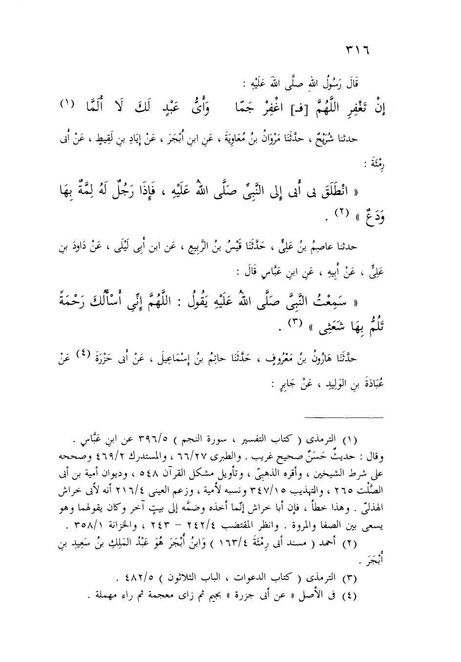 حَدَّثَنَا هَارُونُ بْنُ مَعْرُوفٍ , حَدَّثَنَا حَاتِمُ بْنُ إِسْمَاعِيلَ , عَنْ أَبِي حَزْرَةَ , عَنْ عُبَادَةَ بْنِ الْوَلِيدِ , عَنْ جَابِرٍ , «-[317]- سَرَيْنَا مَعَ النَّبِيِّ صَلَّى اللَّهُ عَلَيْهِ فِي سَفَرٍ , §فَدَعَا بِشَجَرَتَيْنِ , فَلَمَّا كَانَتَا بِالْمَنْصَفِ لَأَمَ بَيْنَهُمَا»