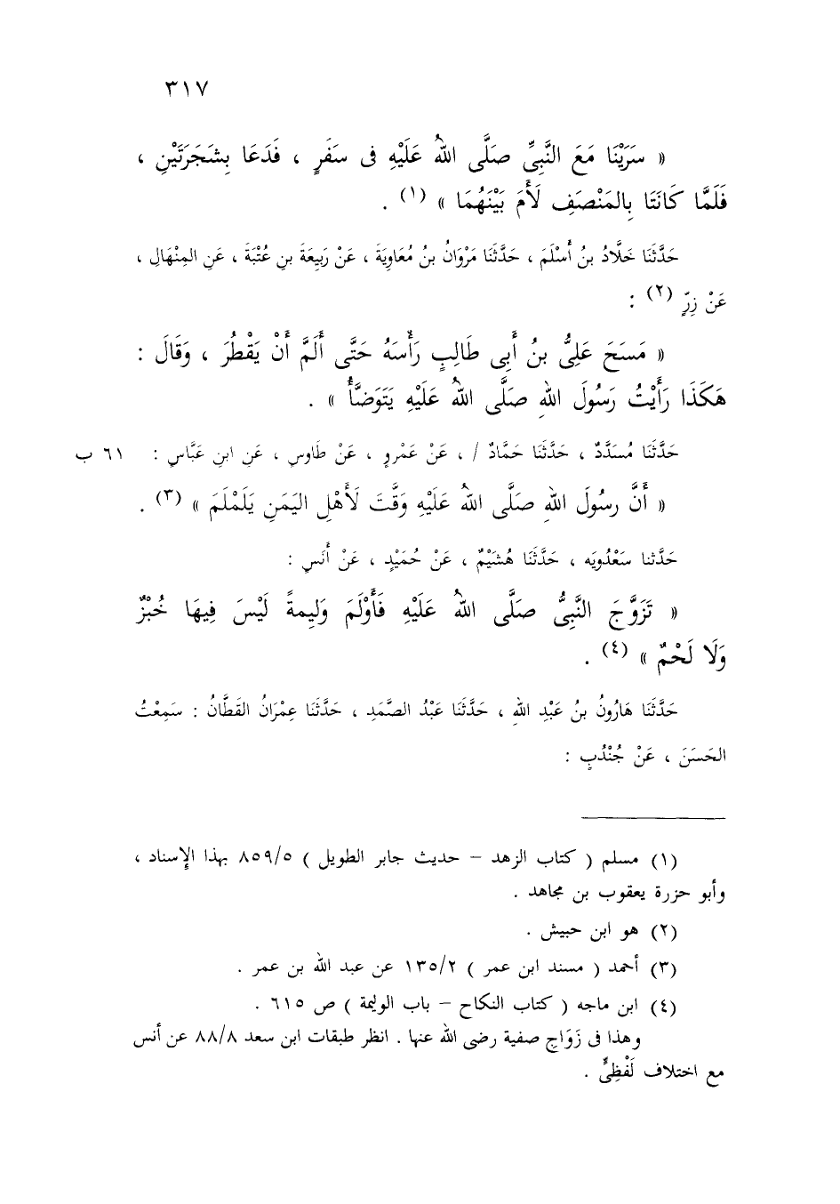 حَدَّثَنَا سَعْدَوَيْهِ , حَدَّثَنَا هُشَيْمٌ , عَنْ حُمَيْدٍ , عَنْ أَنَسٍ , «§تَزَوَّجَ النَّبِيُّ صَلَّى اللَّهُ عَلَيْهِ فَأَوْلَمَ وَلِيمَةً لَيْسَ فِيهَا خُبْزٌ وَلَا لَحْمٌ»