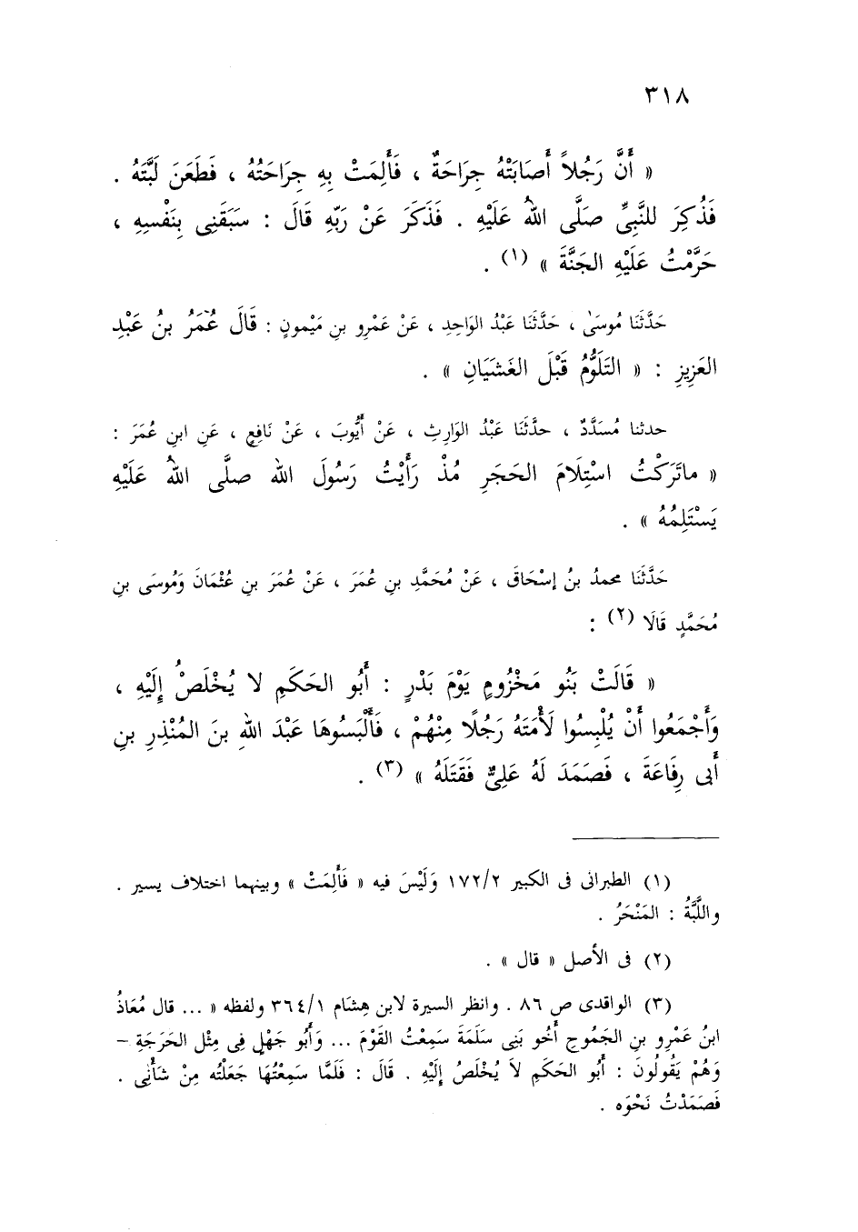 حَدَّثَنَا مُحَمَّدُ بْنُ إِسْحَاقَ , عَنْ مُحَمَّدِ بْنِ عُمَرَ , عَنْ عُمَرَ بْنِ عُثْمَانَ , وَمُوسَى بْنِ مُحَمَّدٍ قَالَا: " §قَالَتْ بَنُو مَخْزُومٍ يَوْمَ بَدْرٍ: أَبُو الْحَكَمِ لَا يُخْلَصُ إِلَيْهِ , وَأَجْمَعُوا أَنْ يُلْبِسُوا لَأْمَتَهُ رَجُلًا مِنْهُمْ , فَأَلْبَسُوهَا عَبْدَ اللَّهِ بْنَ الْمُنْذِرِ بْنِ أَبِي رِفَاعَةَ , فَصَمَدَ لَهُ عَلِيٌّ فَقَتَلَهُ "