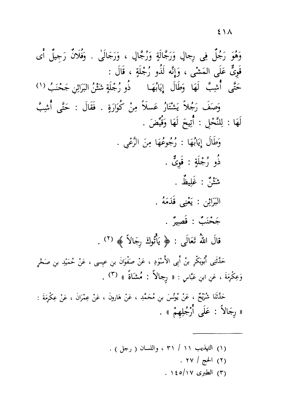 وَصَفَ رَجُلًا يَشْتَارُ عَسَلًا مِنْ كُوَارَةٍ , فَقَالَ: حَتَّى أُشِبَّ لَهَا: لِلنَّحْلِ: أُتِيحَ لَهَا وَقُيِّضَ وَطَالَ إِيَابُهَا: رُجُوعُهَا مِنَ الرَّعْيِ , ذُو رُجْلَةٍ: قَوِيٌّ , شَثْنٌ: غَلِيظٌ الْبَرَاثِنُ: يَعْنِي قَدَمَهُ جَحْنَبٌ: قَصِيرٌ قَالَ اللَّهُ تَعَالَى: {يَأْتُوكَ رِجَالًا} [الحج: 27]