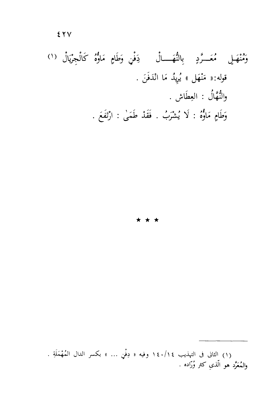 وَمُنْهَلٍ مُعَرَّدٍ بِالنُّهَالْ ... دِفْنٍ وَطَامٍ مَاؤُهُ كَالْجِرْيَالِ