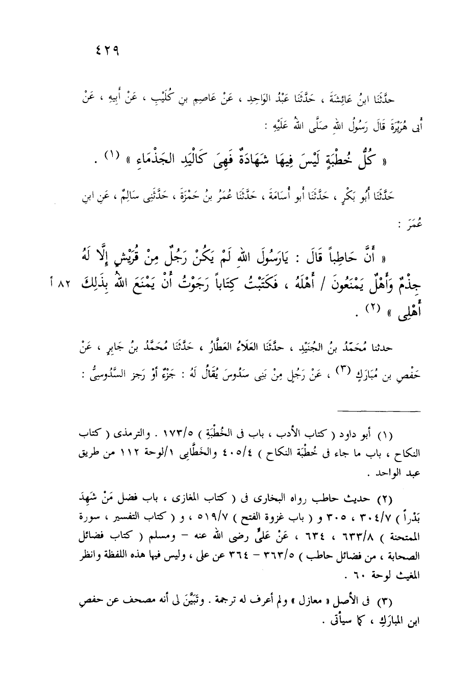 حَدَّثَنَا مُحَمَّدُ بْنُ الْجُنَيْدِ , حَدَّثَنَا الْعَلَاءُ الْعَطَّارُ , حَدَّثَنَا مُحَمَّدُ بْنُ جَابِرٍ , عَنْ حَفْصِ بْنِ مُبَارَكٍ , عَنْ رَجُلٍ , مِنْ بَنِي سَدُوسٍ , يُقَالُ لَهُ: جَزْءٌ أَوْ رَجْزٌ السَّدُوسِيُّ -[430]-: أَتَيْنَا النَّبِيَّ صَلَّى اللَّهُ عَلَيْهِ بِتَمْرٍ مِنْ تَمْرِ الْيَمَامَةِ , فَقَالَ: «مَا هَذَا؟» قُلْتُ: الْجُذَامِيُّ , قَالَ: «§اللَّهُمَّ بَارِكْ فِي الْجُذَامِيِّ» قَوْلُهُ: «لَا تُدِيمُوا النَّظَرَ إِلَى الْمُجَذَّمِينَ» وَكَانَ فِي ثَقِيفٍ رَجُلٌ مَجْذُومٌ , وَالْجُذَامُ: دَاءٌ يَعْتَرِضُ فِي الرَّأْسِ يَتَشَوَّهُ مِنْهُ الْوَجْهُ , فَإِدَامَةُ النَّظَرِ إِلَيْهِمْ. . . مَا لِيَسْتَكِينُوا لِذَلِكَ , وَيَرَوْا فَضْلَ غَيْرِهِمْ عَلَيْهِمْ , فَيَقِلَّ شُكْرُهُمْ , فَيَقُولُ: يَكْفِيَكُمْ قَلِيلُ النَّظَرِ عَنِ الْإِدَامَةِ , وَالْحَمْدُ عَلَى الْعَافِيَةِ وَلَهُ وَجْهٌ آخَرُ: يَخَافُ أَنْ يَتَّصِلَ بِالنَّاظِرِ مِنَ الْمَجْذُومِ مِنْ دَائِهِ مَا يُؤْذِيهِ كَمَا يَتَّصِلُ بِالْعَيْنِ الَّذِي أَصَابَتْهُ الْعَيْنُ مِنَ الْعَائِنِ فَقَدْ زَعَمَ الْأَصْمَعِيُّ عَنْ أَعْرَابِيٍّ كَانَ شَدِيدَ الْعَيْنِ قَالَ: إِذَا رَأَيْتُ شَيْئًا يُعْجِبُنِي انْفَصَلَ مِنْ عَيْنِي حَرَارَةٌ شَدِيدَةٌ , فَكَأَنَّ تِلْكَ الْحَرَارَةَ اتَّصَلَتْ بِالْمَعِينِ , فَعَمِلَتْ فِيهِ وَقَوْلُهُ: «ارْجِعْ فَقَدْ بَايَعْنَاكَ» أَظُنُّهُ خَافَ أَنْ يُدِيمَ النَّظَرَ إِلَيْهِ -[431]- لِمَا غَيَّرَ الْجُذَامُ مِنْ خَلْقِهِ فَيَكْتَئِبُ الْمَنْظُورُ إِلَيْهِ , وَيَقِلُّ شُكْرُهُ إِذِ ابْتَلَاهُ اللَّهُ وَعَافَى غَيْرَهُ قَوْلُهُ: «مَنْ قَرَأَ الْقُرْآنَ ثُمَّ نَسِيَهُ» يَقُولُ: تَرَكَ الْعَمَلَ بِهِ , كَمَا قَالَ: {نَسُوا اللَّهَ فَنَسِيَهُمْ} [التوبة: 67] أَيْ تَرَكُوا الْعَمَلَ بِطَاعَتِهِ فَنَسِيَهُمْ مِنْ رَحْمَتِهِ: تَرَكَهُمْ «لَقِيَ اللَّهَ أَجْذَمَ» مَقْطُوعَ الْيَدِ عَنِ التَّنَاوِلِ مِنْ خَيْرِ الْآخِرَةِ شَيْئًا وَأَنْشَدَنَا ابْنُ الْأَعْرَابِيِّ: