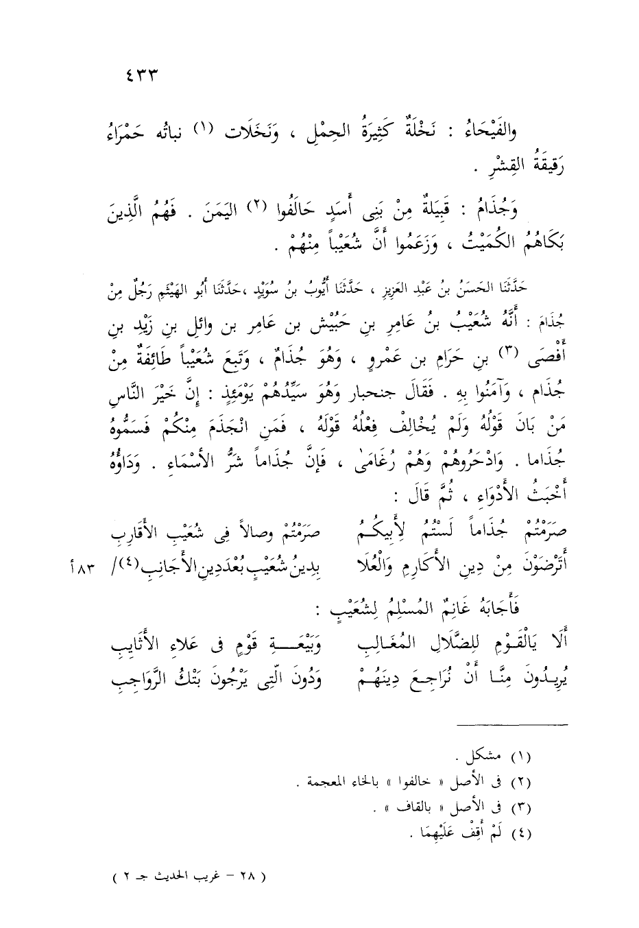 حَدَّثَنَا الْحَسَنُ بْنُ عَبْدِ الْعَزِيزِ , حَدَّثَنَا أَيُّوبُ بْنُ سُوَيْدٍ , حَدَّثَنَا أَبُو الْهَيْثَمِ , رَجُلٌ مِنْ جُذَامٍ أَنَّهُ شُعَيْبُ بْنُ عَامِرِ بْنِ حُبَيْشِ بْنِ عَامِرِ بْنِ وَائِلِ بْنِ زَيْدِ بْنِ أَفْصَى بْنِ حَرَامِ بْنِ عَمْرٍو , وَهُوَ جُذَامٌ , §وَتَبِعَ شُعَيْبًا طَائِفَةٌ مِنْ جُذَامٍ , وَآمَنُوا بِهِ، فَقَالَ جُنْحَبَارُ وَهُوَ سَيِّدُهُمْ يَوْمَئِذٍ: إِنَّ خَيْرَ النَّاسِ مَنْ بَانَ قَوْلُهُ , وَلَمْ يُخَالِفْ فِعْلُهُ قَوْلَهُ , فَمَنِ انْجِذَمَ مِنْكُمْ فَسَمُّوهُ جُذَامًا , وَادْحَرُوهُمْ وَهُمْ رُغَامَى , فَإِنَّ جُذَامًا شَرُّ الْأَسْمَاءِ , وَدَاؤُهُ أَخْبَثُ الْأَدْوَاءِ، ثُمَّ قَالَ: