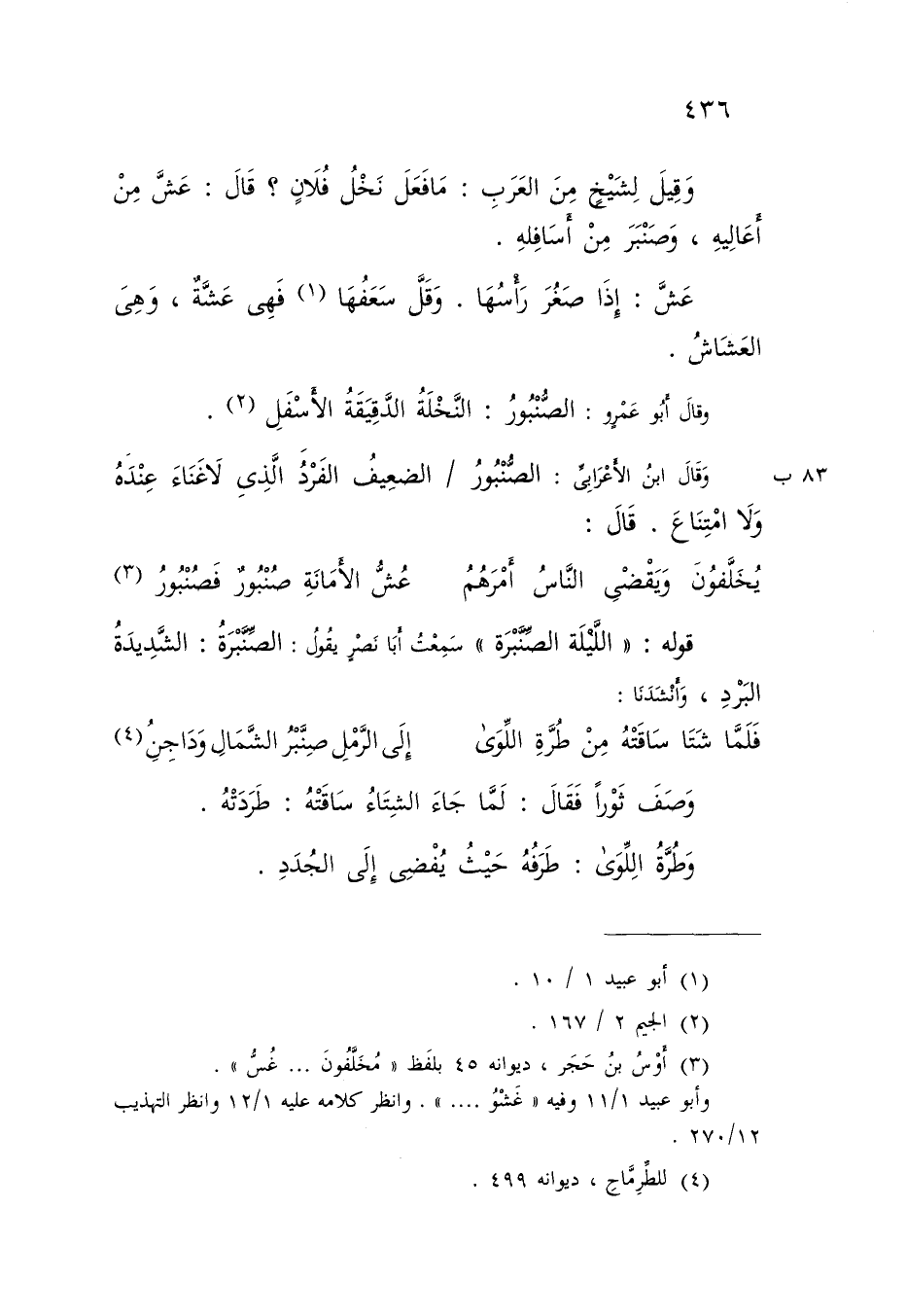 وَقِيلَ لِشَيْخٍ مِنَ الْعَرَبِ: مَا فَعَلَ نَخْلُ فُلَانٍ؟ قَالَ: عَشَّ مِنَ أَعَالِيهِ , وَصَنْبَرَ مِنْ أَسَافِلِهِ عَشَّ: إِذَا صَغُرَ رَأْسُهَا , وَقَلَّ سَعَفُهَا فَهِيَ عَشَّةٌ وَهِيَ الْعَشَاشُ وَقَالَ أَبُو عَمْرٍو: الصُّنْبُورُ: النَّخْلَةُ الدَّقِيقَةُ الْأَسْفَلِ وَقَالَ ابْنُ الْأَعْرَابِيِّ: الصُّنْبُورُ الضَّعِيفُ الْفَرْدُ الَّذِي لَا غَنَاءَ عِنْدَهُ وَلَا امْتِنَاعَ , قَالَ: