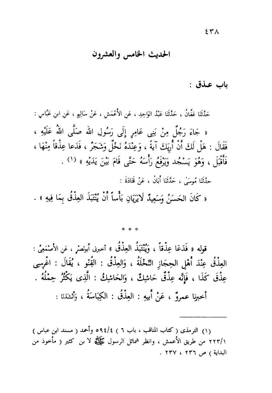 حَدَّثَنَا مُوسَى , حَدَّثَنَا أَبَانُ , عَنْ قَتَادَةَ , كَانَ الْحَسَنُ وَسَعِيدٌ §لَا يَرَيَانِ بَأْسًا أَنْ يُنْتَبَذَ الْعِذْقُ بِمَا فِيهِ قَوْلُهُ: " فَدَعَا عِذْقًا , وَيُنْتَبَذُ الْعِذْقُ أَخْبَرَنِي أَبُو نَصْرٍ , عَنِ الْأَصْمَعِيِّ: الْعِذْقُ عِنْدَ أَهْلِ الْحِجَازِ النَّخْلَةُ , وَالْعِذْقُ: الْقِنْوُ , يُقَالُ: اغْرِسِي عِذْقَ كَذَا , فَإِنَّهُ عِذْقٌ حَاشِكٌ , وَالْحَاشِكُ: الَّذِي يَكْثُرُ حِمْلُهُ أَخْبَرَنَا عَمْرٌو , عَنْ أَبِيهِ: الْعِذْقُ: الْكِبَاسَةُ وَأَنْشَدَنَا:
