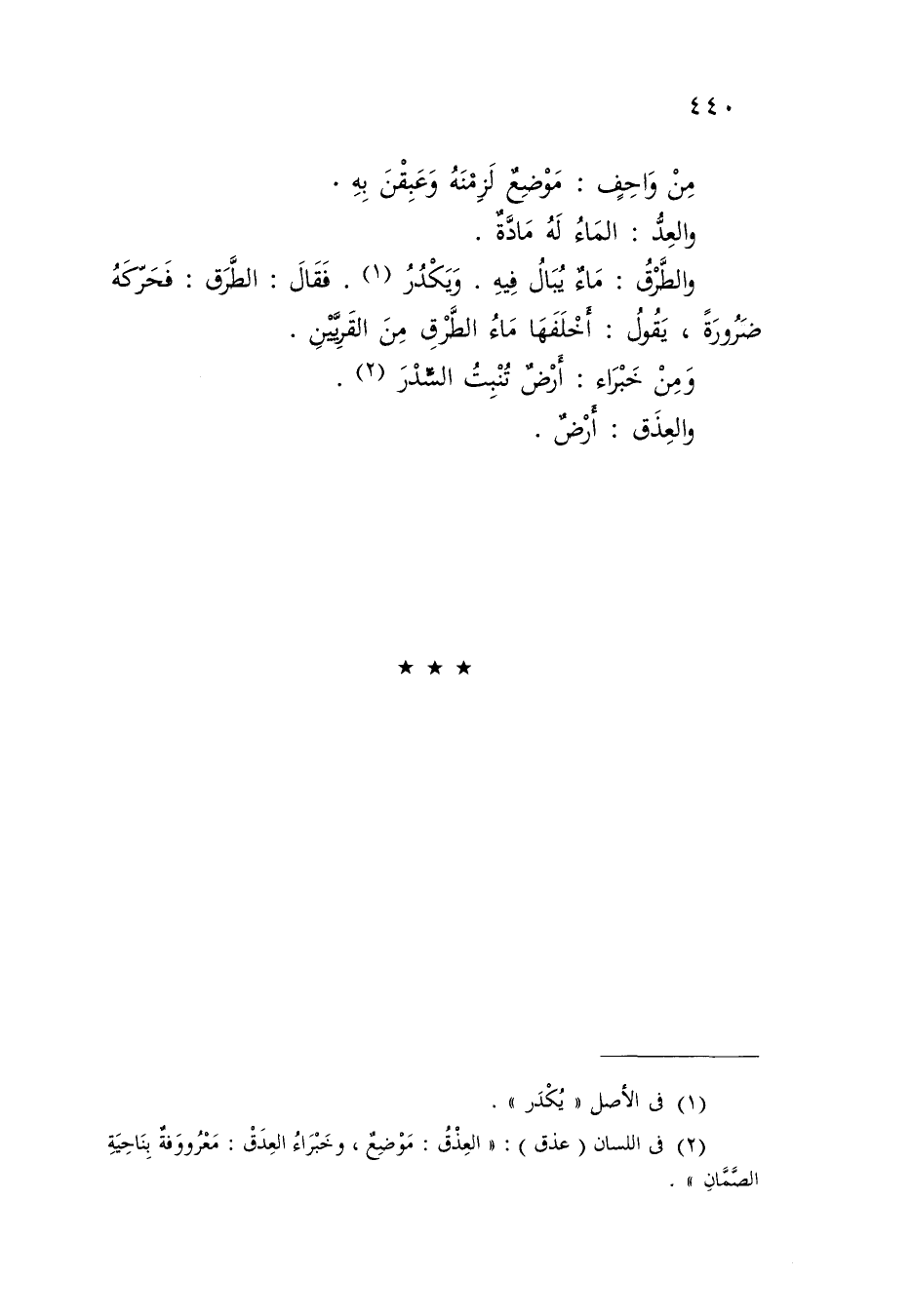 مِنْ وَاحِفٍ: مَوْضِعٌ لَزِمْنَهُ وَعَبِقْنَ بِهِ وَالْعِدُّ: الْمَاءُ لَهُ مَادَّةٌ وَالطَّرْقُ: مَاءٌ يُبَالُ فِيهِ , وَيَكْدُرُ , فَقَالَ: الطَّرَقُ فَحَرَّكَهُ ضَرُورَةً , يَقُولُ: أَخْلَفَهَا مَاءُ الطَّرْقِ مِنَ الْقَرِيَّيْنِ , وَمِنْ خَبْرَاءَ: أَرْضٌ تُنْبِتُ السِّدْرَ , وَالْعِذَقُ: أَرْضٌ