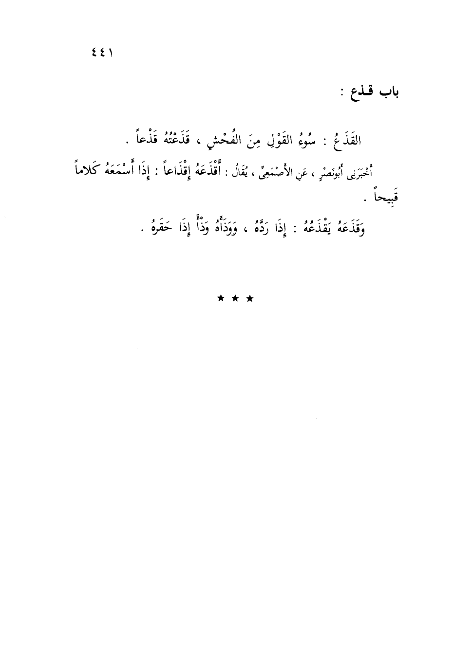 §بَابُ: قذع الْقَذَعُ: سُوءُ الْقَوْلِ مِنَ الْفُحْشِ , قَذَعْتُهُ قَذْعًا أَخْبَرَنِي أَبُو نَصْرٍ , عَنِ الْأَصْمَعِيِّ يُقَالُ: أَقْذَعَهُ إِقْذَاعًا: إِذَا أَسْمَعَهُ كَلَامًا قَبِيحًا , وَقَذَعَهُ يَقْذَعُهُ: إِذَا رَدَّهُ , وَوَذَأَهُ وَذْأً إِذَا حَقَرَهُ