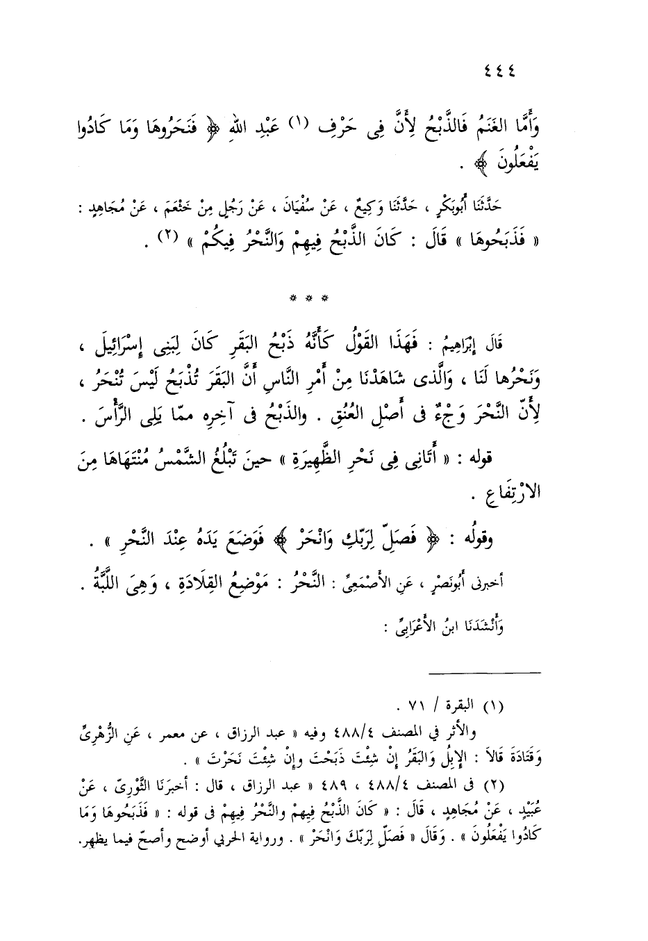 حَدَّثَنَا أَبُو بَكْرٍ , حَدَّثَنَا وَكِيعٌ , عَنْ سُفْيَانَ , عَنْ رَجُلٍ , مِنْ خَثْعَمَ , عَنْ مُجَاهِدٍ , {§فَذَبَحُوهَا} [البقرة: 71] قَالَ: «كَانَ الذَّبْحُ فِيهِمْ , وَالنَّحْرُ فِيكُمْ» قَالَ إِبْرَاهِيمُ: فَهَذَا الْقَوْلُ كَأَنَّهُ ذَبْحُ الْبَقَرِ كَانَ لِبَنِي إِسْرَائِيلَ , وَنَحْرُهَا لَنَا , وَالَّذِي شَاهَدْنَا مِنْ أَمْرِ النَّاسِ أَنَّ الْبَقَرَ تُذْبَحُ لَيْسَ تُنْحَرُ؛ لِأَنَّ النَّحْرَ وَجْءٌ فِي أَصْلِ الْعُنُقِ , وَالذَّبْحَ فِي آخِرِهِ مِمَّا يَلِي الرَّأْسَ , قَوْلُهُ: أَتَانِي فِي نَحْرِ الظَّهِيرَةِ حِينَ تَبْلُغُ الشَّمْسُ مُنْتَهَاهَا مِنَ الِارْتِفَاعِ وَقَولُهُ: {فَصَلِّ لِرَبِّكَ وَانْحَرْ} [الكوثر: 2] فَوَضَعَ يَدَهُ عِنْدَ النَّحْرِ أَخْبَرَنِي أَبُو نَصْرٍ , عَنِ الْأَصْمَعِيِّ النَّحْرُ: مَوْضِعُ الْقِلَادَةِ , وَهِيَ اللَّبَّةُ وَأَنْشَدَنَا ابْنُ الْأَعْرَابِيِّ: