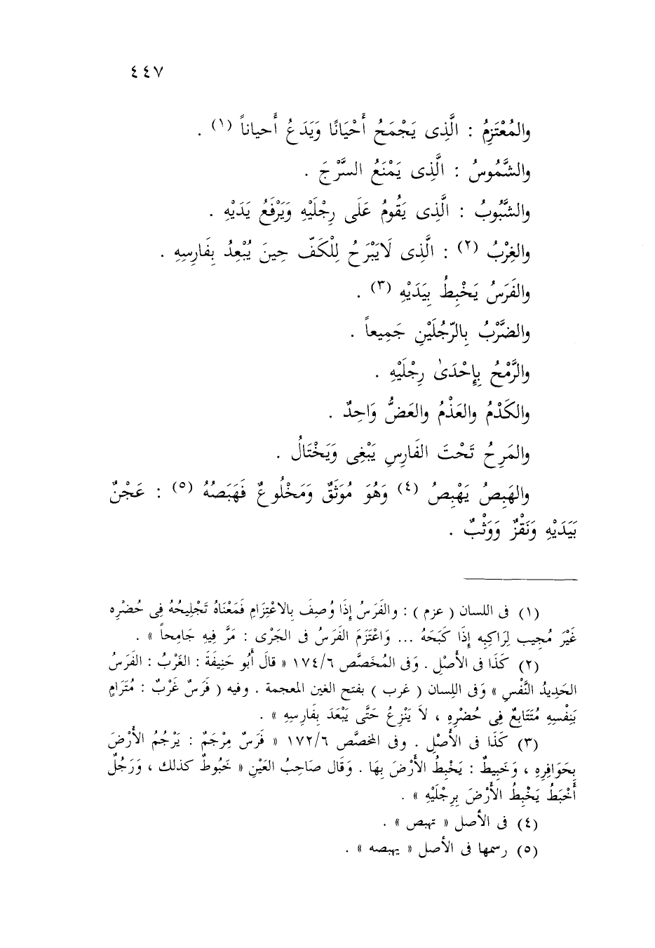 وَالْمُعْتَزِمُ: الَّذِي يَجْمَحُ أَحْيَانًا , وَيَدَعُ أَحْيَانًا وَالشَّمُوسُ: الَّذِي يَمْنَعُ السَّرْجَ وَالشَّبُوبُ: الَّذِي يَقُومُ عَلَى رِجْلَيْهِ , وَيَرْفَعُ يَدَيْهِ وَالْغِرْبُ: الَّذِي لَا يَبْرَحُ لِلْكَفِّ حِينَ يُبْعِدُ بِفَارِسِهِ وَالْفَرَسُ يَخْبِطُ بِيَدَيْهِ وَالضَّرْبُ بِالرِّجْلَيْنِ جَمِيعًا وَالرُّمْحُ بِإِحْدَى رِجْلَيْهِ وَالْكَدْمُ وَالْعَذْمُ وَالْعَضُّ وَاحِدٌ وَالْمَرِحُ تَحْتَ الْفَارِسِ يَبْغِي وَيَخْتَالُ وَالْهَبِصُ يَهْبِصُ وَهُوَ مُوثَقٌ , وَمَخْلُوعٌ , فَهَبَصُهُ: عَجْنٌ بِيَدَيْهِ , وَنَقْزٌ , وَوَثْبٌ -[448]- وَالزَّعَلُ: خَبَبٌ وَاسْتِنَانٌ , وَكَثْرَةُ صَهِيلٍ وَالِاسْتِنَانُ: أَنْ يَحْضُرَ , وَلَيْسَ عَلَيْهِ فَارِسٌ , فَإِذَا رَفَعَ ذَنَبَهُ فِي اسْتِنَانِهِ , أَوْ تَحْتَ فَارِسِهِ فِي حُضْرِهِ فَهُوَ مُكْتَئِرٌ
