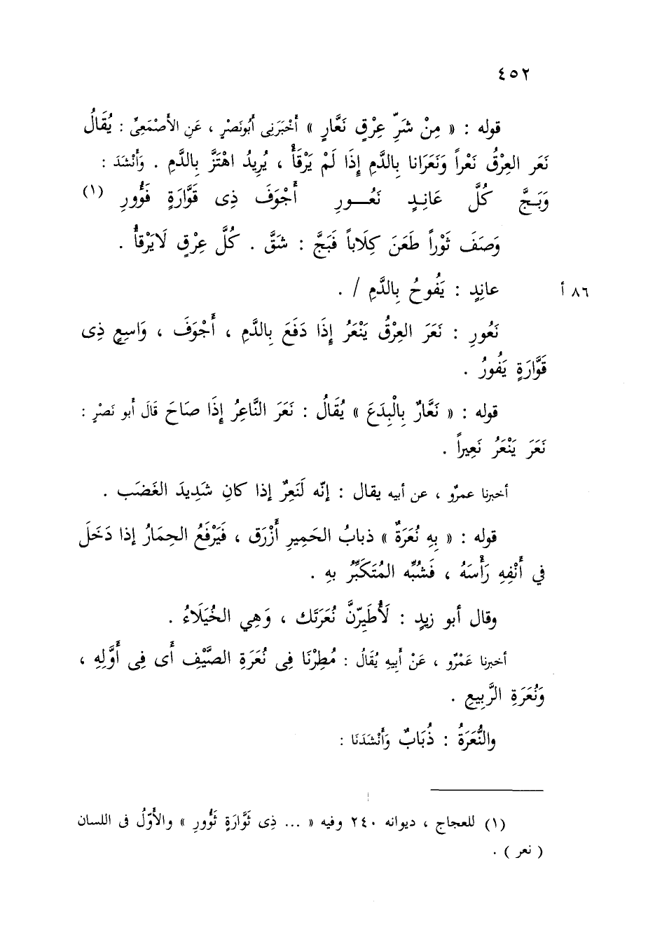 وَصَفَ ثَوْرًا طَعَنَ كِلَابًا فَبَجَّ: شَقَّ كُلَّ عِرْقٍ لَا يَرْقَأُ عَانِدٍ: يَفُوحُ بِالدَّمِ نَعُورِ: نَعَرَ الْعِرْقُ يَنْعَرُ إِذَا دَفَعَ بِالدَّمِ أَجْوَفَ: وَاسِعٍ ذِي قَوَّارَةٍ يَفُورُ قَوْلُهُ: «نَعَّارٌ بِالْبِدَعِ» يُقَالُ: نَعَرَ النَّاعِرُ , إِذَا صَاحَ , قَالَ أَبُو نَصْرٍ: نَعَرَ يَنْعَرُ نَعِيرًا أَخْبَرَنَا عَمْرٌو , عَنْ أَبِيهِ يُقَالُ: إِنَّهُ لَنَعِرٌ إِذَا كَانَ شَدِيدَ الْغَضَبِ قَوْلُهُ: «بِهِ نُعَرَةٌ» ذُبَابُ الْحَمِيرِ أَزْرَقُ , فَيَرْفَعُ الْحِمَارُ إِذَا دَخَلَ فِي أَنْفِهِ رَأْسَهُ , فَشُبِّهَ الْمُتَكَبِّرُ بِهِ وَقَالَ أَبُو زَيْدٍ: لَأُطَيِّرَنَّ نُعَرَتَكَ , وَهِيَ الْخُيَلَاءُ أَخْبَرَنَا عَمْرٌو , عَنْ أَبِيهِ: يُقَالُ: مُطِرْنَا فِي نُعَرَةِ الصَّيْفِ , أَيْ فِي أَوَّلِهِ , وَنُعَرَةُ الرَّبِيعِ وَالنُّعَرَةُ: ذُبَابٌ , وَأَنْشَدَنَا: